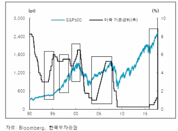 그에 따라 과거 역사를 보면 대부분 금리가 올라가는 시기 때는 주가도 함께 증가했습니다.