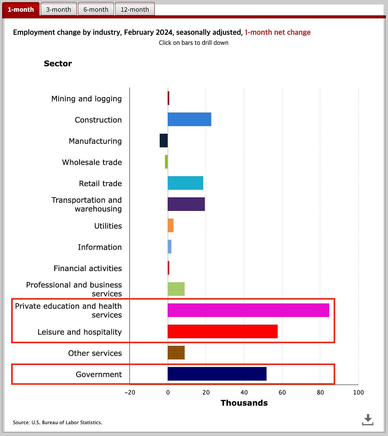 정리하면, 이번 BLS 비농업고용지수는 일자리가 많이 증가하긴 했지만 과대집계 되었을 가능성이 매우 높고, 늘어난 고용 부문도 민간교육, 보건서비스, 정부 위주이기 때문에 경기에 영향을 그리 크게 미치진 못합니다.