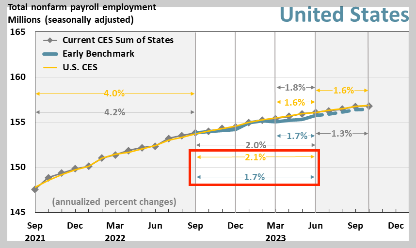 실제로 필라델피아 연은에서는 비농업고용지표 집계 방식인 CES 방식을 보안해서 분기별 발표를 해주는 QCEW 데이터를 발표해주는데, BLS 고용지표의 경우 22년 4분기부터 23년 3분기까지의 취업자수가 2.1%로 집계가 되지만, 필라델피아 연은에서 발표하는 QCEW 집계 방식은 동기간 1.7% 수준으로 발표가 됩니다.