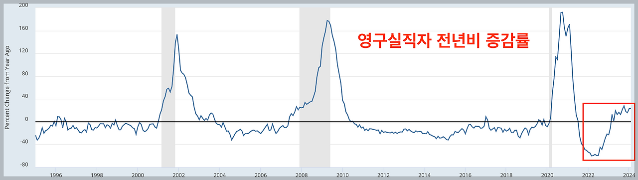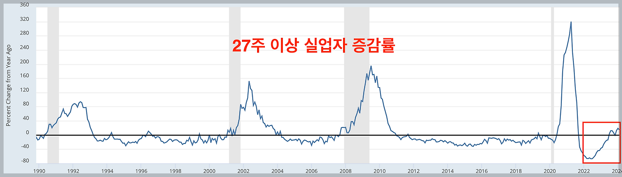 먼저, 미국의 27주 이상 실업자 증감률이 가파르게 증가하는 추세입니다. 미국에서 실업수당을 받을 수 있는 최대 기간(주마다 다르지만 평균적으로)은 27주입니다. 즉 27주 이상 실직자가 된다면 실업수당을 받을 수 없게 되는 뜻이 됩니다.