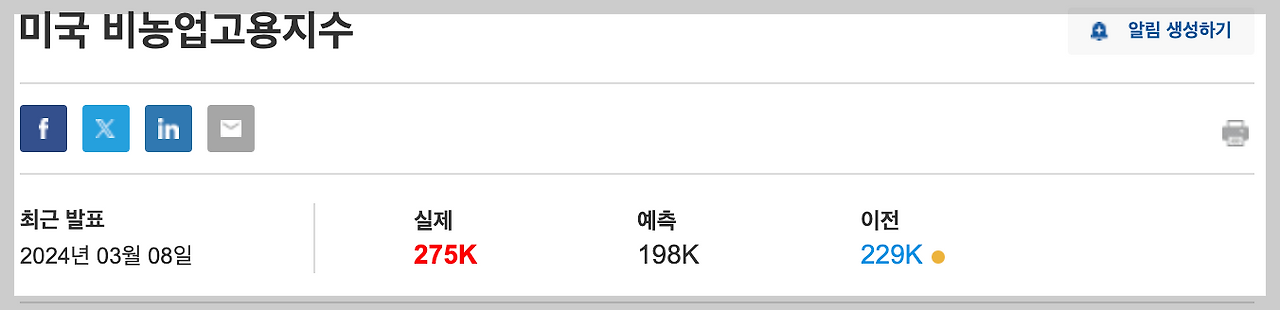 경제학계에서 비농업고용이 150,000명 이상이면 긍정적인 경기사이클로 해석을 합니다. 즉 현재는 275,000명이기 때문에 노동시장이 좋다고 해석할 수 있다는 겁니다. 또한 이전치와 예측치 대비해서도 증가했기 때문에 노동시장이 타이트하고, 강하다고 충분히 해석할 수 있습니다.