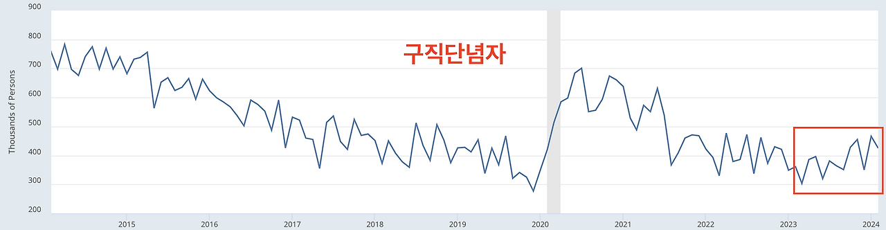 또한, 미국의 구직단념자도 최근 증가하는 추세로 이어지고 있습니다. 구직단념자란 원하는 일자리가 없어 노동시장을 떠나는 사람들을 뜻하는데요, 구직단념자의 증가도 '노동가능인구'를 줄이는 원인이 됩니다.