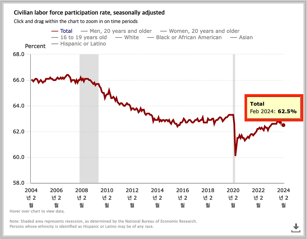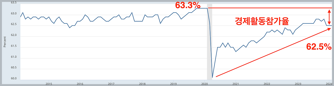 현재 미국의 경제활동참가율은 62.5%로, 코로나 전 63.3% 보다 낮은 수준입니다. 얼마 차이가 나지 않으니 경제활동참가율이 코로나 이전 수준으로 회복해도 큰 문제가 없지 않을까!? 이런 생각이 충분히 들 수 있습니다.