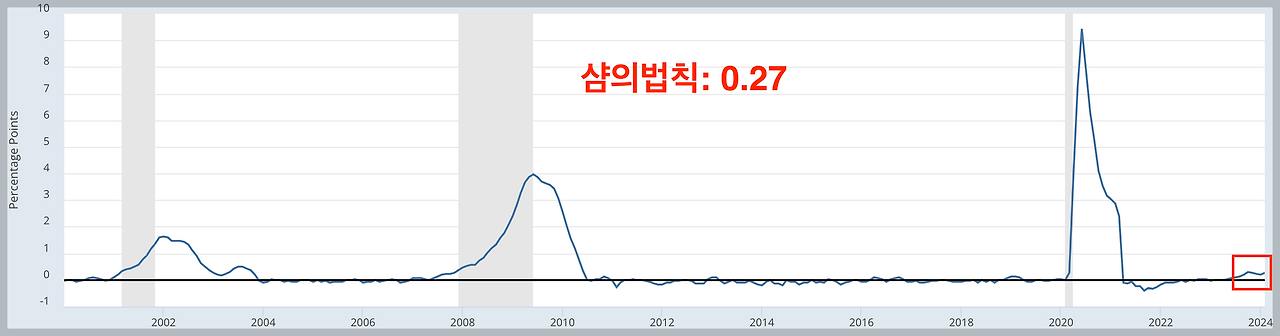그리고 현재 실업률의 샴의법칙을 통하면 0.27 수준을 보이고 있습니다. 경기침체의 가능성을 0.5로 보고 있기 때문에 아직도 낮은 수준이라 볼 수 있습니다.