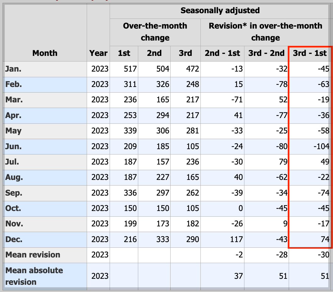 그리고 비농업고용지수의 계정 변동폭도 매우 큽니다. 2023년 7월과 12월을 제외하고 모두 하향 수정된 걸 확인할 수 있습니다.