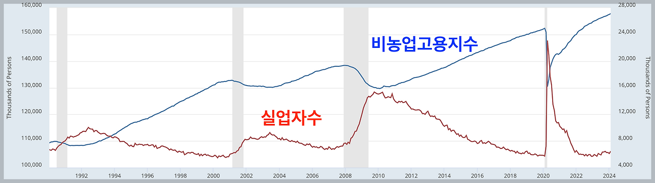 위 그래프처럼 실업자수와 비농업고용자수는 반대로 나오는 게 정상입니다. 고용이 감소하는 것은 실업이 증가하는 뜻이고, 고용이 증가하는 것은 실업이 감소하게 되죠. 결국 이 두 지표는 같게 흐르긴 하지만 단기적으로는 서로 다른 모습을 보일 순 있습니다.