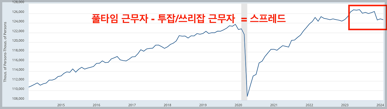 풀타임 근무자가 하락하는 시기에는 항상 경기침체가 발생했었는데, 2000년, 2008년, 2020년 때 모두 절대수치는 항상 높았습니다. 다시 말해 현재 풀타임 근무자가 코로나 이전보다 많은 게 중요한 게 아니고, 멀티잡이 증가하고 있는 것이 중요하다 볼 수 있습니다.