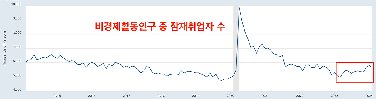 그리고, 현재 비경제활동 사람들이 점점 다시 취업을 원하는 상태로 이어지고 있는 중입니다. 비경제활동인구는 당연히 경제활동인구가 아니기 때문에 경제활동참가율에 포함되지 않습니다. 만약 비경제활동인구에서 노동참여를 원하는 수가 증가하게 되다면, 이는 곧 비경제활동인구의 감소로 이어지게 되고 경제활동인구를 증가시키게 됩니다.