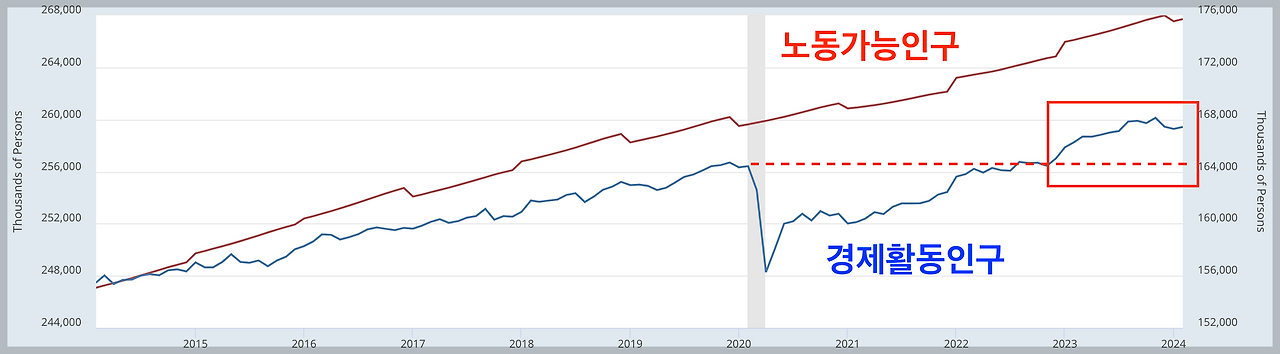 현재 미국의 노동가능인구는 계속 증가하는 추세이고, 경제활동인구 또한 계속 증가하는 추세입니다. 그런데 특이점은 경제활동인구는 코로나 전 수준을 이미 훨씬 넘은 상태입니다.