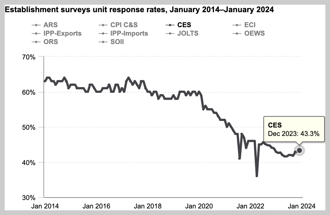 일단 비농업고용지수의 응답률은 43%로 매우 낮은 수준을 보여줍니다. 즉 조사대상자들의 절반 이상이 응답을 제대로 하지 않고 있다는 뜻이 되는 것이죠. 여기서부터 조사의 신뢰도가 많이 낮다는 걸 확인할 수 있습니다.