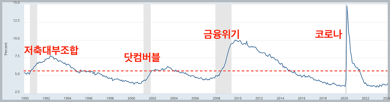 과거 실업률이 5% 이상만 넘어도 경기침체는 필연적으로 발생했습니다.
