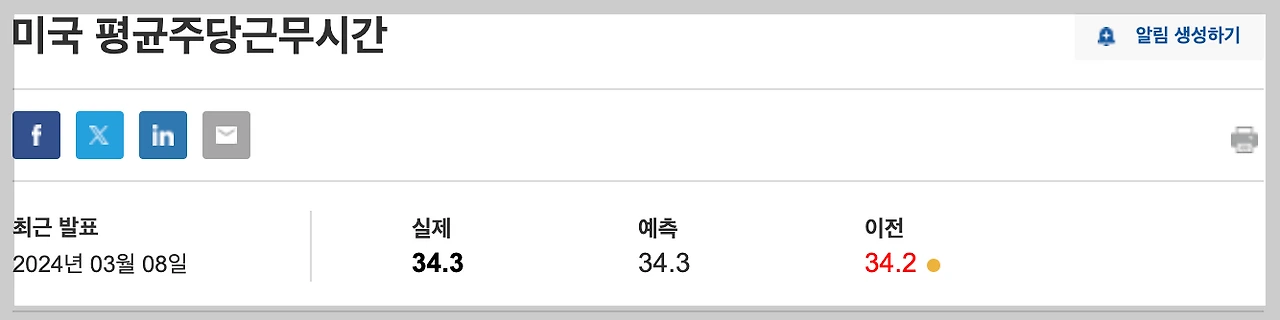 이번 미국의 평균주당근무시간은 이전치(34.2)보다 소폭 증가한 34.3을 보였습니다. 근무시간이 증가했다는 건 노동시장의 개선이라 해석할 수 있습니다.