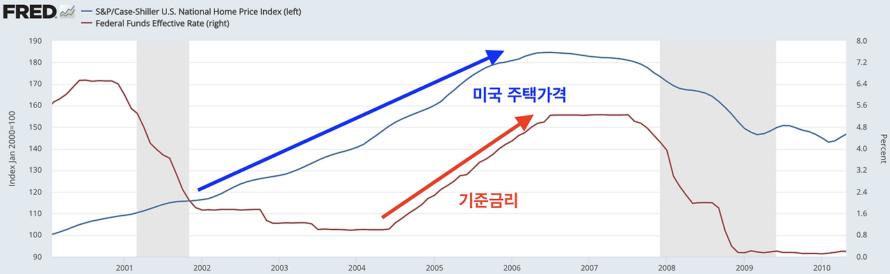 2000년 초반 미국의 중앙은행(Fed)의 의장인 앨런 그린스펀은 닷컴버블, 911 테러, 이라크 전쟁 등으로 죽어가는 경제를 살리기 위해 당시 빠르게 금리를 내려 경기회복을 이끌었습니다. 경기가 회복된다는 것은 곧 '수요'가 증가한다는 뜻이기 때문에 미국은 수요가 증가함에 따라 경기가 회복에 경기과열을 막기 위해 기준금리를 다시 올리기 시작합니다.