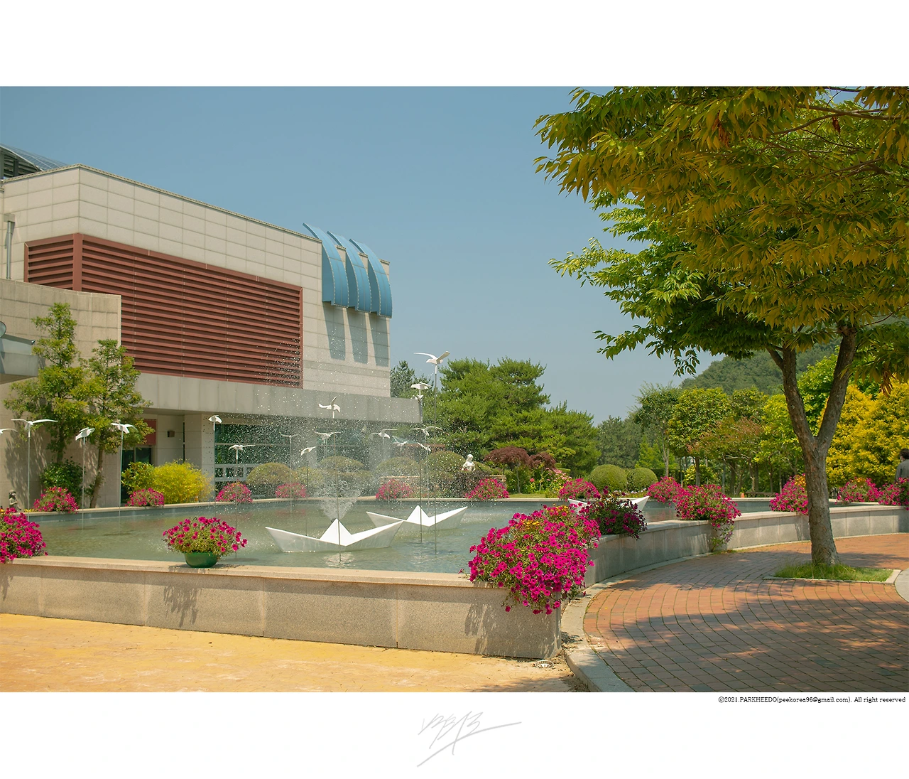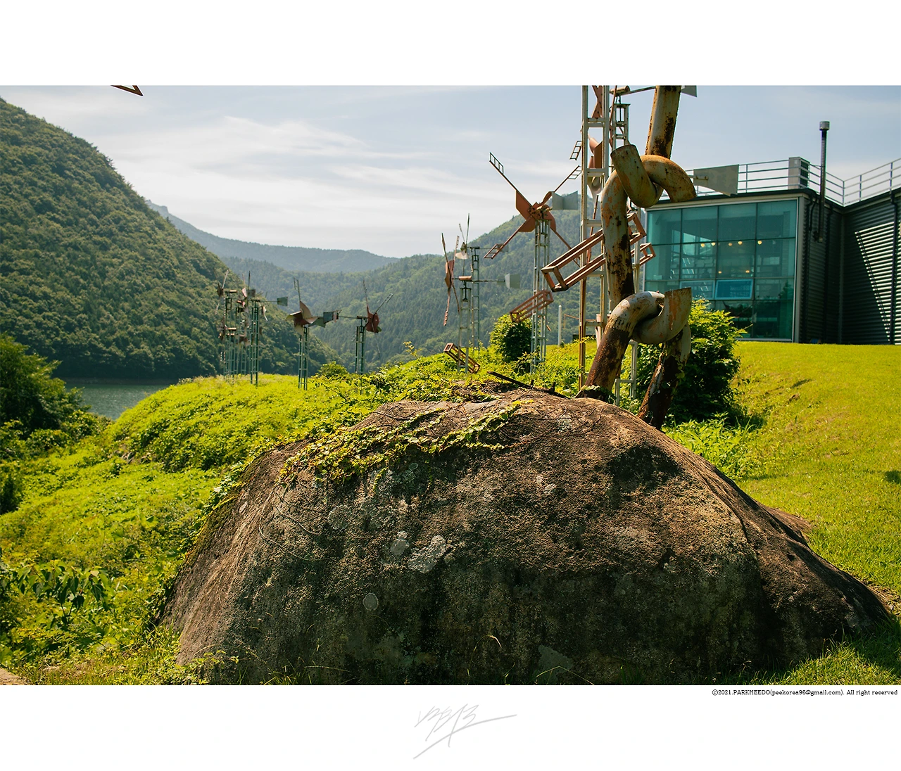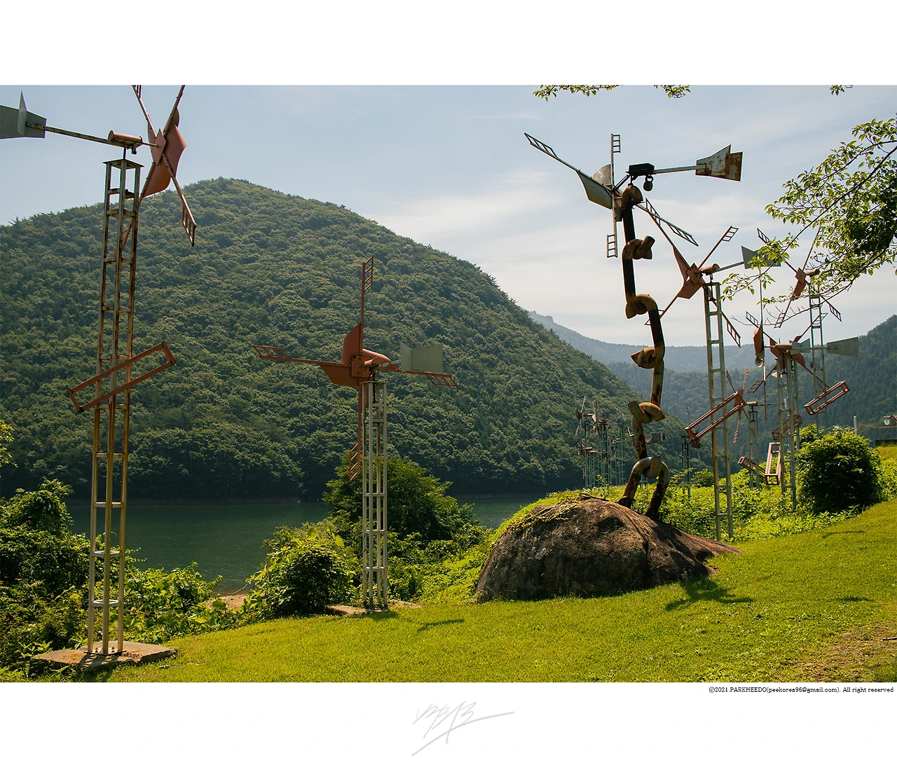 이름이 2000년대 초반의 감성 같다. 실제로 이 미술관의 로고(?)도 옛날 감성이 물씬 풍긴다. 아주 긍정적인 뜻이다. 장애를 가진 분이 아니라면, 처음에 주차하고 조금 걸어 내려가야 한다. 그리 멀지는 않다. 내려가니 ‘오길 잘했구나’ 생각했다. 보통 산과 강에 위치한 미술관이나 관광지는 거의 없다. 있어 봐야 정자다. 하지만 이 미술관은 산과 강이 굽어가는 곳에 있다. 이곳이 한국과 현대가 아주 절묘하게 섞여 있었다. 바람흔적이라는 이름에 걸맞게 바람개비들이 많이 있었다. 높이와 위치, 디자인과 방향 모두 빈틈없이 훌륭했다. 애니메이션의 한 장면에 들어온 것처럼 황홀했다. 이는 바람을 테마로 설치미술가 최영호 작가가 설치한 작품이다. 역시 미술가는 아무나 하는 것이 아닌가 보다. 이곳은 마치 현실과 환상이 공존하는 듯했다.