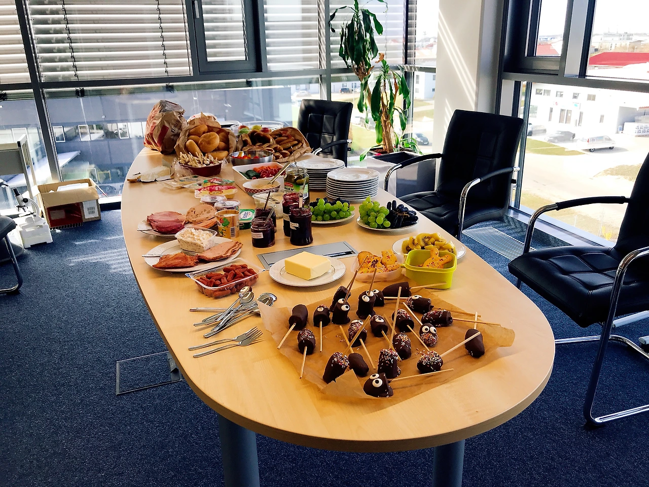 우리 팀은 3년 전까지 다른 부서에 포함되어 있다가 지금의 부서가 새로 생기면서 떨어져 나왔는데, 그전 부서에서 매주 금요일 앉은자리로 나누어서 8-9명이 아침식사를 준비했었다. 빵들과, 스틱채소 몇 가지, 빵에 발라먹을 것들과 치즈, 햄, 잼과 버터 누텔라, 간단한 과일이나 디저트류를 가지고 와서 아침식사를 했다.