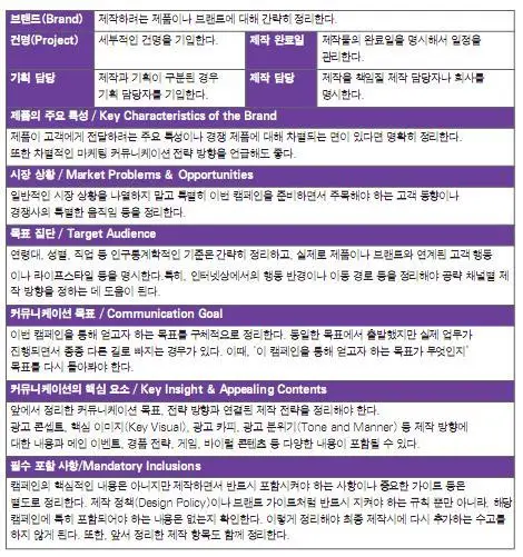 등의 내용을 상세히 정리해서 광고주가 전달 주는 내용이다.