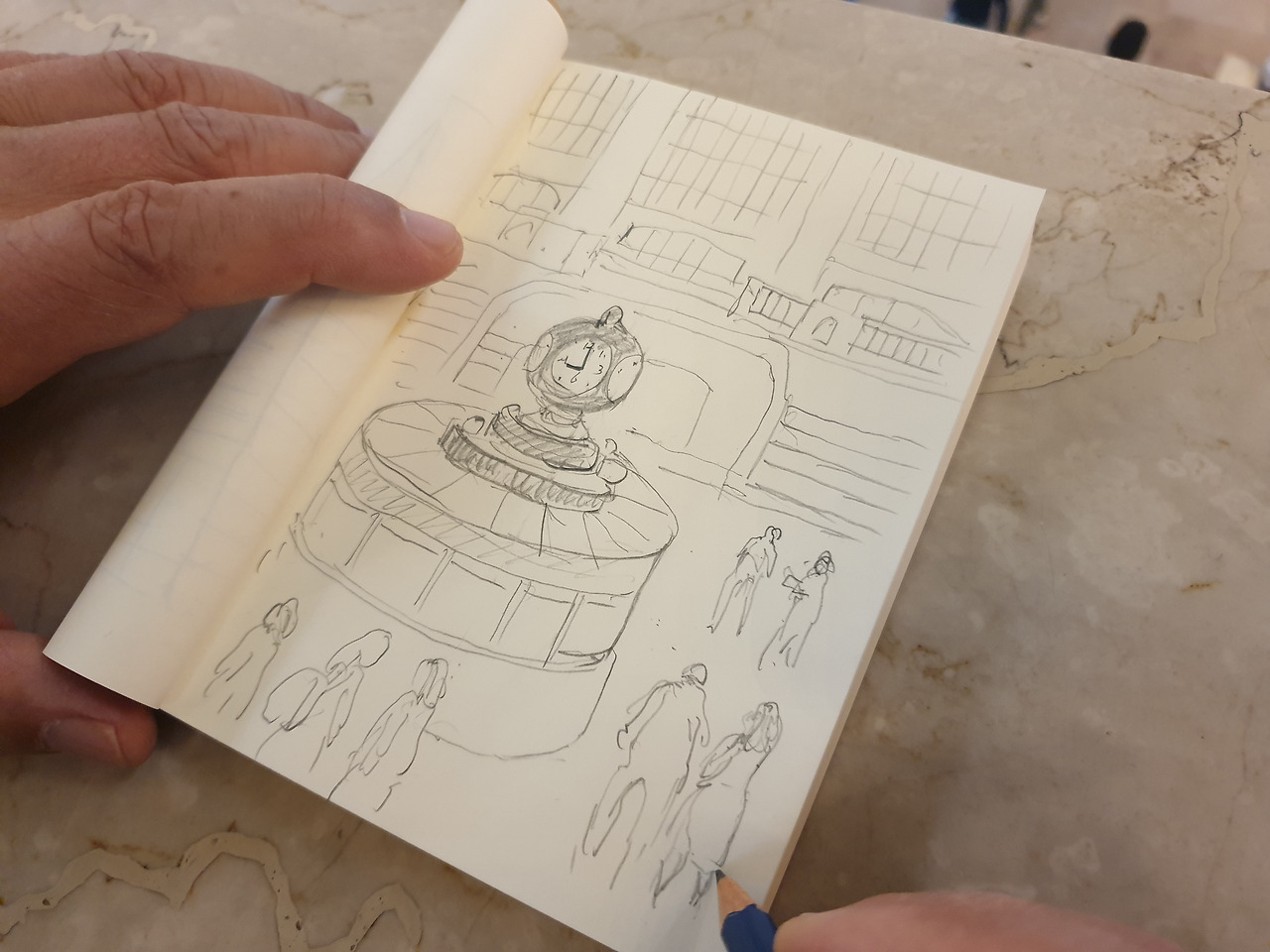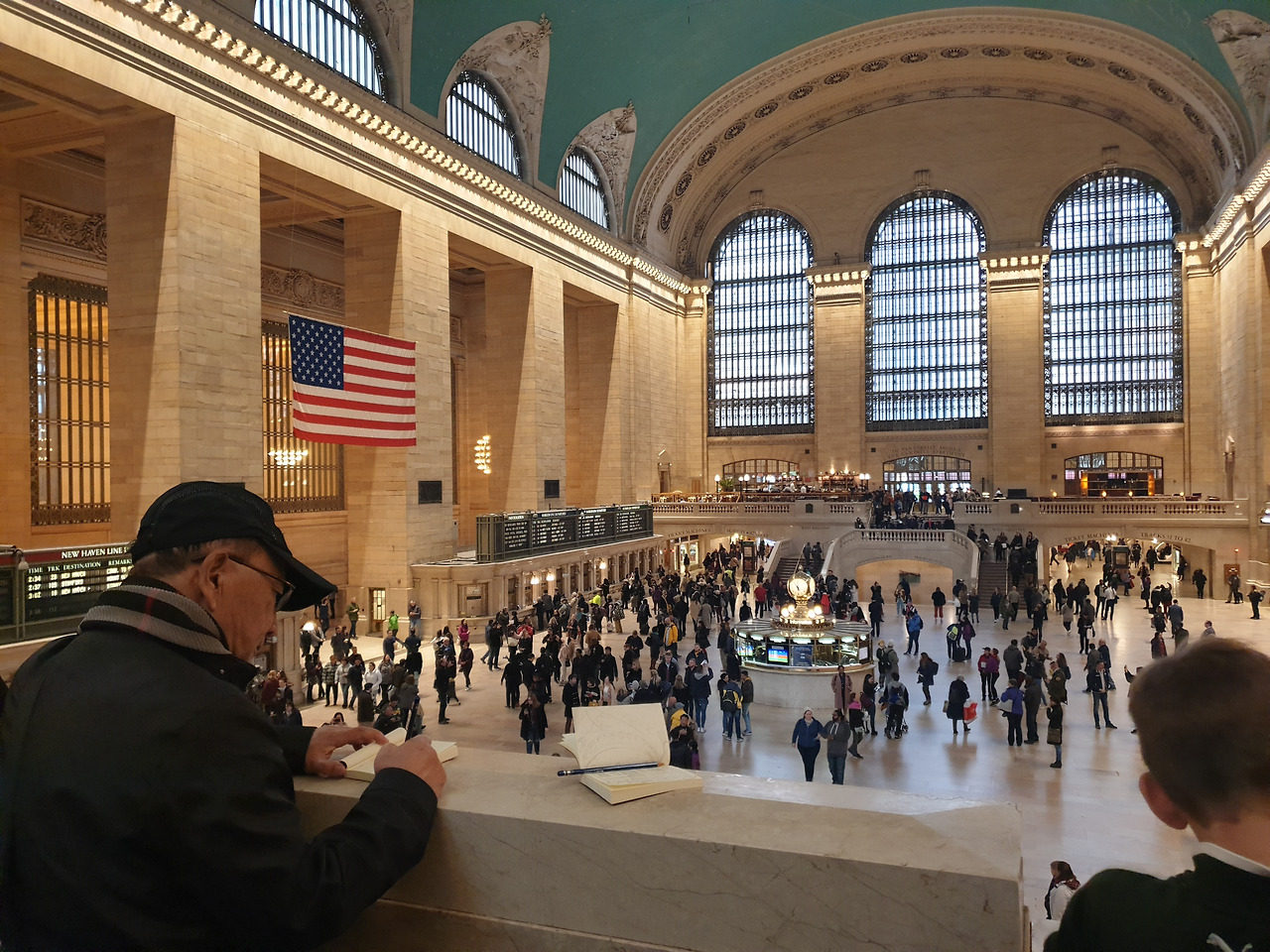 선생님, 학생들, 커리큘럼 등 오늘 함께할 모든 것에 대한 소개를 짧게 마친 뒤, 그랜드 센트럴 역 곳곳에서 그림을 그리기 시작했다. 드디어! 기다렸던 순간이다! 한국에서부터 꿈꿔왔던 모습이다. '아빠가 화가 포스를 뿜뿜하며 전문가의 품격이 묻어나는 마성의 스케치를 구사한다 - 학생들 그림을 봐주던 선생님이 우연히 아빠의 그림을 본다 - 아빠의 실력에 소스라치게 놀란다 - 엄청난 리액션과 함께 칭찬을 퍼붓는다 - 학생들 모두가 와서 아빠의 스케치를 구경하며 감탄한다 - 아빠의 어깨가 하늘로 솟는다 - 그걸 지켜보는 내 광대도 솟는다’ 뭐 이런 식의 스토리 보드였다. 그리고 그것이 실제로 일어났습니다. 낄낄. 학생들은 물론이고 선생님조차도 아빠가 연필 선을 이어나가는 모습을 관찰하며 감탄사를 연신 내뱉었다. 그래, 이거지. 그림 실력은 국경을 초월한다니까. 그런데 재미있게도, 생각보다는 별로 아빠의 어깨가 하늘로 치솟지 않았다. 아빠는 당연했던 것이다!