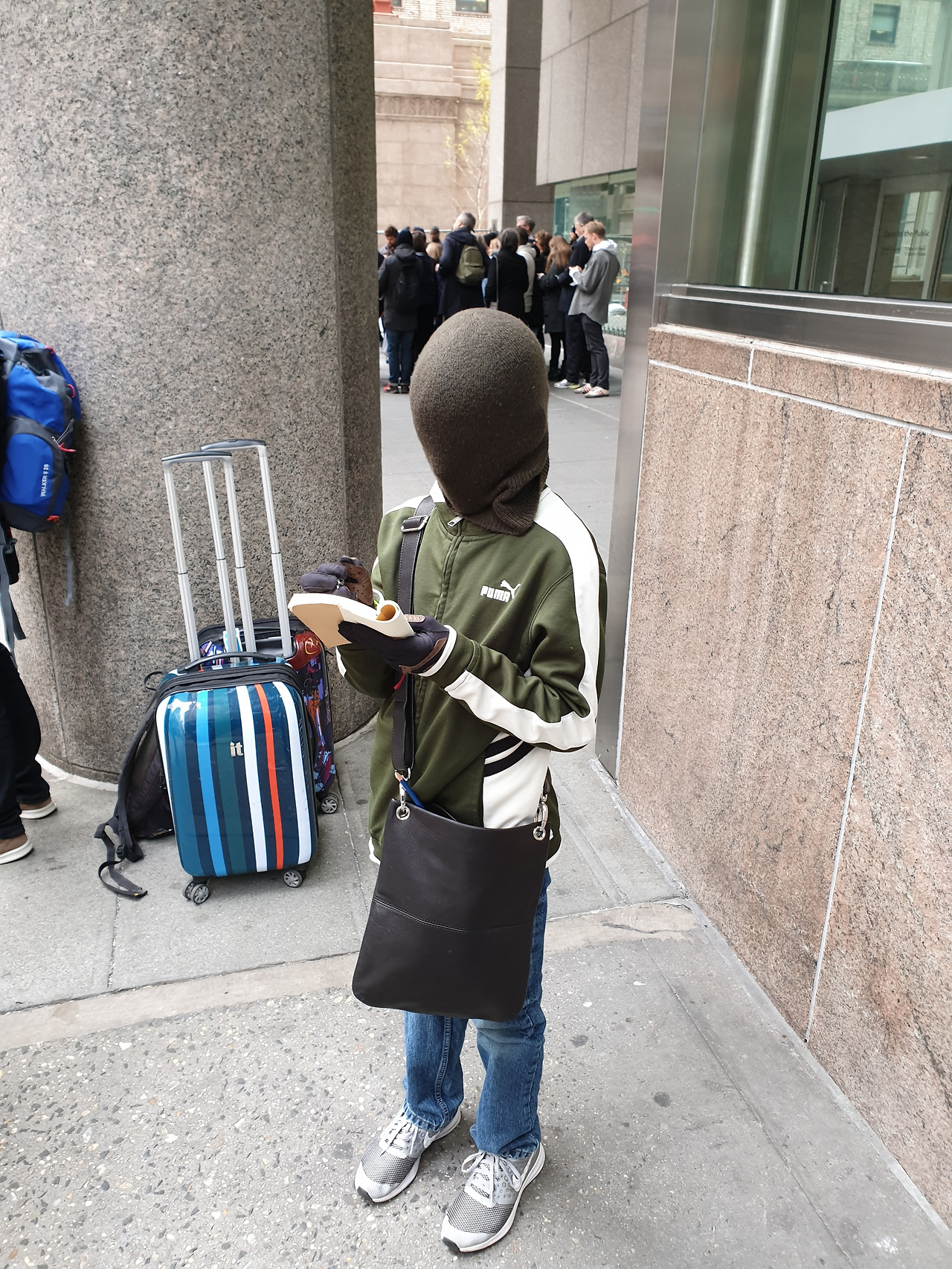 펜실베이니아에서 뉴욕으로 여행 온 모녀는, 오늘이 첫날이라며 씩씩하게도 큰 캐리어를 한 개씩 끌고 왔다. 딸은 화가가 되는 것이 꿈인 소녀 아티스트다. 귀엽고 사랑스러운 소년 Sullivan과 함께 온 짧은 머리의 Bridgit은 사우스캐롤라이나 사람이었다. 카키색 비니를 깊게 눌러쓴 아들과 달리 가장 좋은 옷을 예쁘게 입고 싶었다면서 머리끝부터 발 끝까지 흰색으로 두르고 온 모습이 마치 유럽 귀족 같았다. 살짝 비껴 쓴 흰색 중절모가 킬링 포인트.