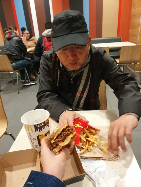“아빠, 여기는 맥도널드가 24시간이야. 내가 학생 때도 그랬어요. 지금은 한국에도 24시간 운영하는 매장이 많은데, 10년 전만 해도 별로 없었거든. 처음에 우리나라도 24시간 여는 매장을 만든다고 했을 때 좀 놀랐어. 미국에서만 가능한 일인 줄 알았으니까. 그리고 여기는 가난한 사람들이 많이 와. 싸잖아요. 우리나라도 패스트푸드점은 학생들이 많이 가잖아. 그래서 이렇게 어수선하고 정신이 없어. 밤에는 위험하기도 해. 노숙자들이랑 불량학생들이 여기서 밤을 많이 새 거든. 근데 또 가끔 화장실 가고 싶을 때는 가뭄의 단비 같은 존재지. 나도 가끔 화장실 급할 때 오곤 했었는데, 아빠 화장실 가고 싶으시죠? 어디 보자. 역시 비밀번호를 걸어놨네.”