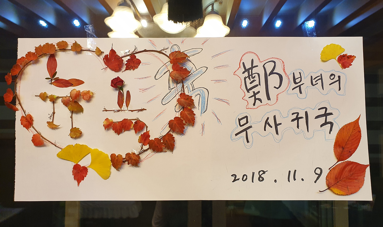 집에 도착하자, 엄마가 머리털나고 처음 보는 신기한 플래카드를 펼쳐 들고 나오면서 우리를 환영했다. 뒷산에 떨어진 가을 낙엽을 주워서 만들었다고 했다. 아빠가 집안의 대소사가 있을 때마다 축하 포스터를 그려온 것에서 영감을 받으셨다나. 거하게 효녀 노릇 한 번 했더니, 엄마가 직접 만든 플래카드를 다 받아보네. 할 만하구먼. 효도라는 거.