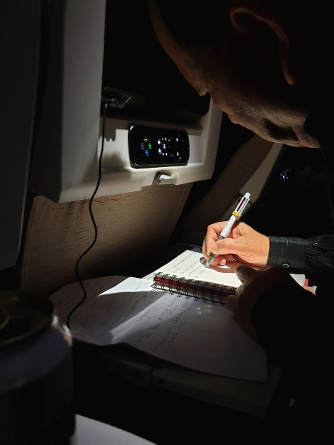 한 번의 식사와 한 개의 샌드위치를 야무지게 챙겨 먹고, 와칸다 포에버를 속으로 힘차게 외치면서 블랙 팬서를 완주했는데도 도착하려면 아직 한참이나 남아 있었다. 지루하고 피곤하지만, 비행기에서 보내는 이 시간은 또 이것대로 아쉽다. 여행의 마지막 여운을 있는 힘껏 느끼면서 뒹굴뒹굴하다가 깜빡 잠이 들어 버렸다. 약한 터뷸런스가 몸을 흔들어 깨우는 바람에 슬며시 눈을 뜨니, 아빠의 반짝이는 정수리가 어두운 비행기 안을 환히 비추고 있었다. 뭐 하시나 봤더니, 뉴욕 일기를 쓰고 계셨다.