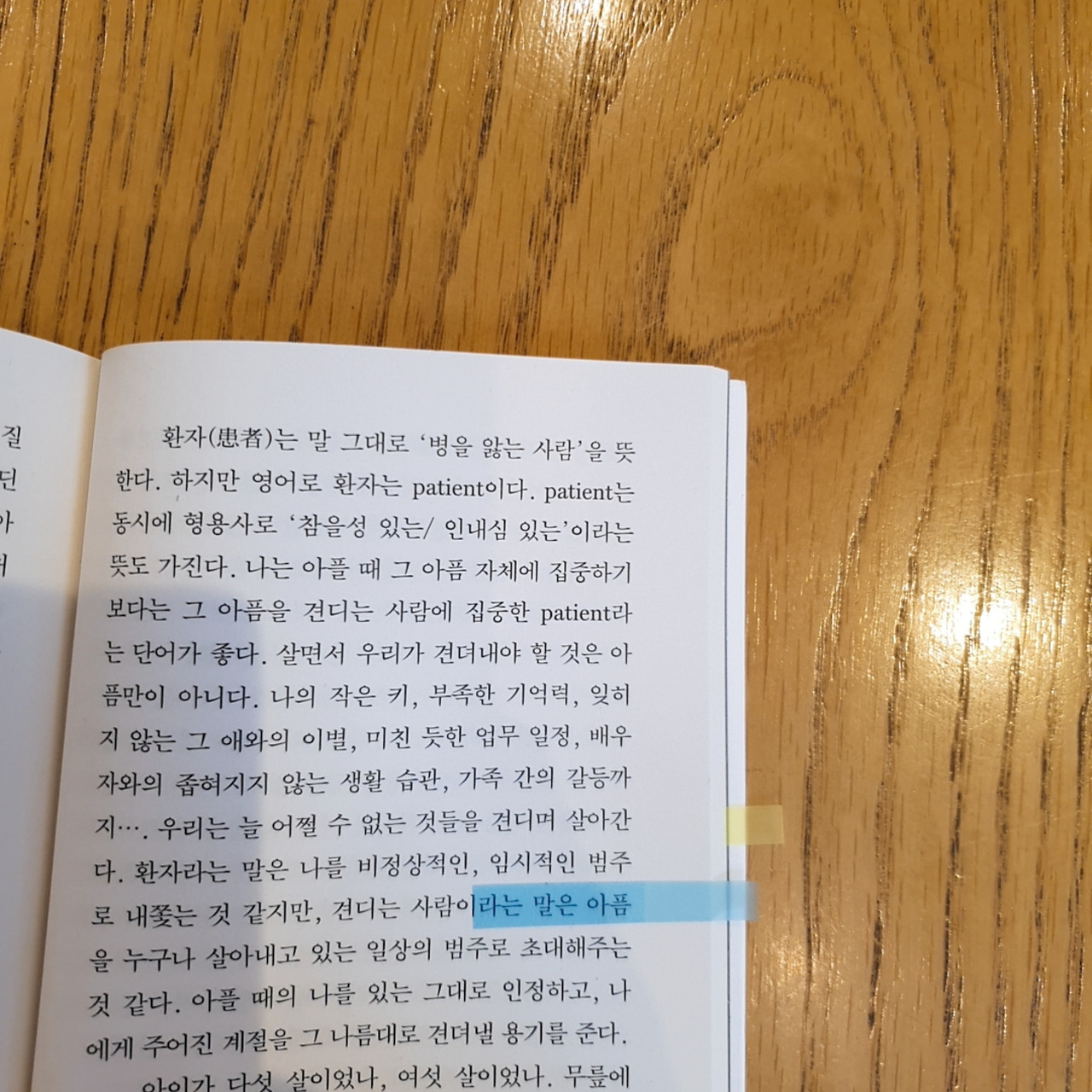 "나는 아플 때 그 아픔 자체에 집중하기 보다는 그 아픔을 견디는 사람에 집중한 patient라는 단어가 좋다. [...] 환자라는 말은 나를 비정상적인, 임시적인 범주로 내쫓는 것 같지만, 견디는 사람이라는 말은 아픔을 누구나 살아내고 있는 일상의 범주로 초대해주는 것 같다. 아플 때의 나를 있는 그대로 인정하고, 나에게 주어진 계절을 그 나름대로 견뎌낼 용기를 준다."
