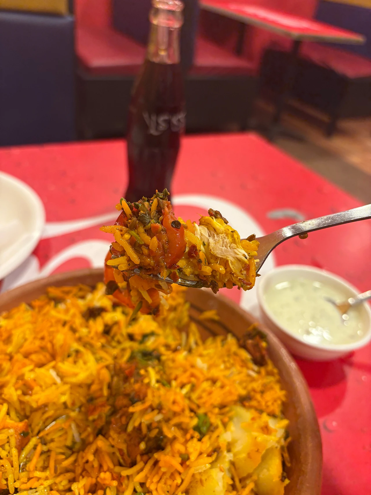 닭요리를 너무 좋아하기에 파키스탄의 전통음식인 ‘치킨 비리야니’를 포기할 수 없었다. 9시 넘어 도착한 숙소에서 간단하게 짐을 풀자 배가 고팠다. 파키스탄 전통음식이 먹고 싶었다. 당장 구글 검색을 해보니 아직 문을 닫지 않은 ‘치킨 비리야니’ 맛집이 있었다. 평점은 4.1점에 코멘트는 무려 600개가 넘는 가게를 찾았다. (이런 곳은 찐이다) 비리야니는 팔레스타인에서 먹은 마크루바 (냄비 안에 층층이 고기, 야채, 밥을 쌓고 찐 음식)와 비슷했는데, 카레와 같은 양념이 마크루바와 다른 지점이었다. 택시 어플로 택시를 불러서 다급하게 간 비리야니 맛집에는 늦은 시간이어서 그런지 손님이 별로 없었다. 가게에는 비리야니 이외에도 메뉴가 몇 개 있었는데, 가장 유명한 치킨 비리야니와 콜라를 시켰다. 이상하게 한국에 있을 때에는 저속노화 어쩌고 때문에 최대한 탄산음료를 피하는데, 외국만 나가면 액상과당인 탄산음료는 꼭 떼려야 뗄 수 없는 단짝이 되곤 한다.