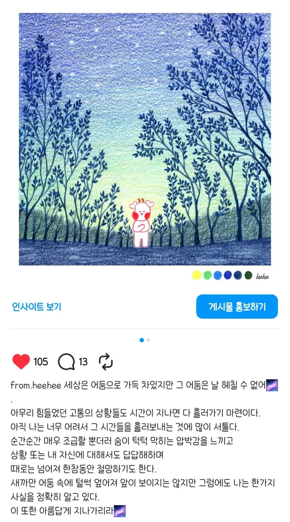 그렇게 그림을 업로드할 때는 풍경 속 우슴이가 전하고 싶은 마음을 짤막한 글로 덧붙이곤 했다.