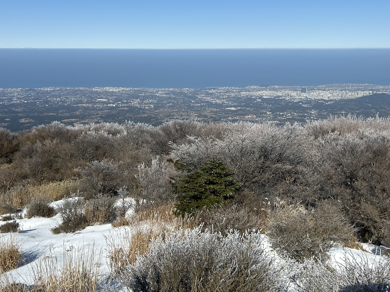 그래도 풍경이 멋지다. 백록담과 제주 바다가 다 보인다.