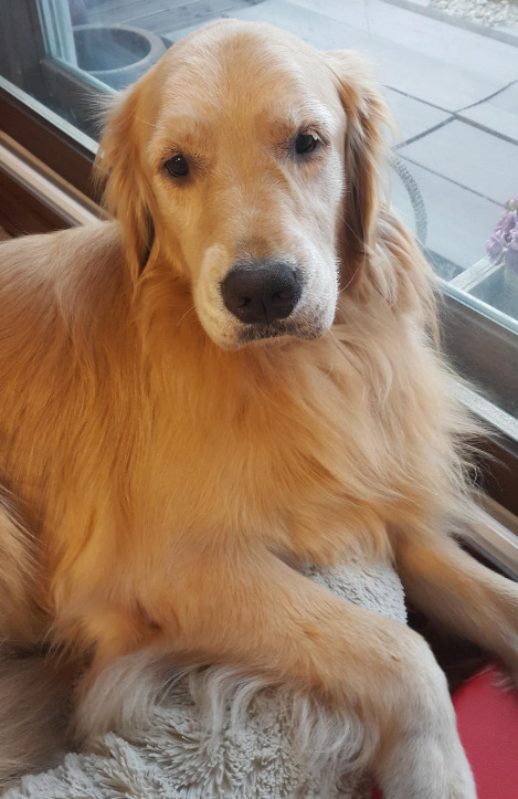둘째, 행복이. 골든 리트리버. 역시 다섯 살. 여자. 몸무게 28~30킬로를 왔다 갔다 함. 걸그룹도 아닌데 다이어트가 생활인 강아지. 창피하게도 정신 못 차리고 돈 주고 입양함. 몸값 제법 나감. 멍청하고 아무 생각 없어 똥꼬 발랄한 것이 최대의 매력. 손은 많이 가나 가끔 빵 터지는 매력이 있는 아이.