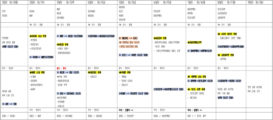 위에는 그날의 방문 도시. 아래는 호텔정보 ( * 아직 미정)