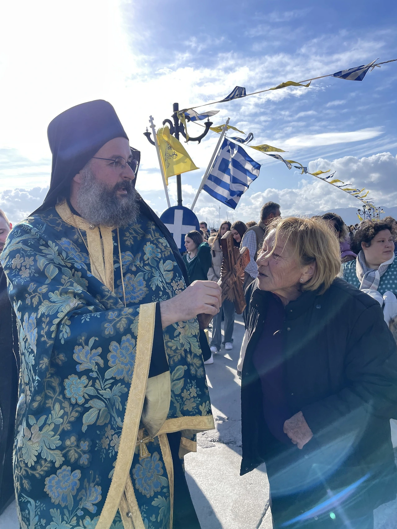 수영은 누가, 언제 하는 것일까? 궁금해하는데 사제는 한참 동안 배가 들어오는 항구가장자리 높은 곳에 올라가 연설을 한다. 그 연설이 끝날 즈음 손에 쥐고 있던 나무 십자가를 물에 던졌다. 동시에 사제 주변에서 웃통 벗고 준비하고 있던 사람들이 하나같이 물에 뛰어들었다! 아무리 따뜻한 그리스라지만 겨울은 겨울이고 물은 차다. 그럼에도 불구하고 수십 명의 사람들이 자연스럽게 뛰어든 것은 사제가 던진 나무 십자가를 물에서 구하면 행운이 따르고 그 지역의 영웅처럼 여겨진다는 전통이 있다.