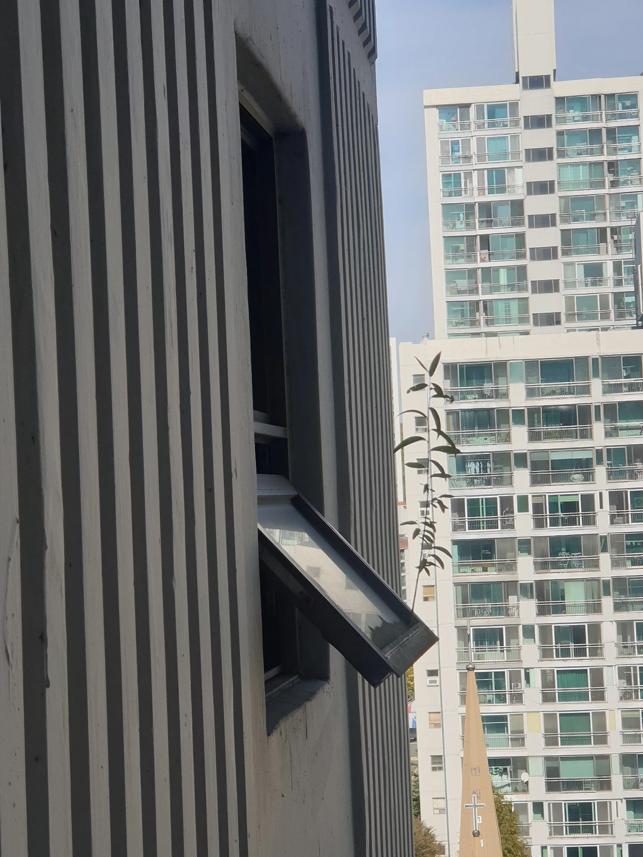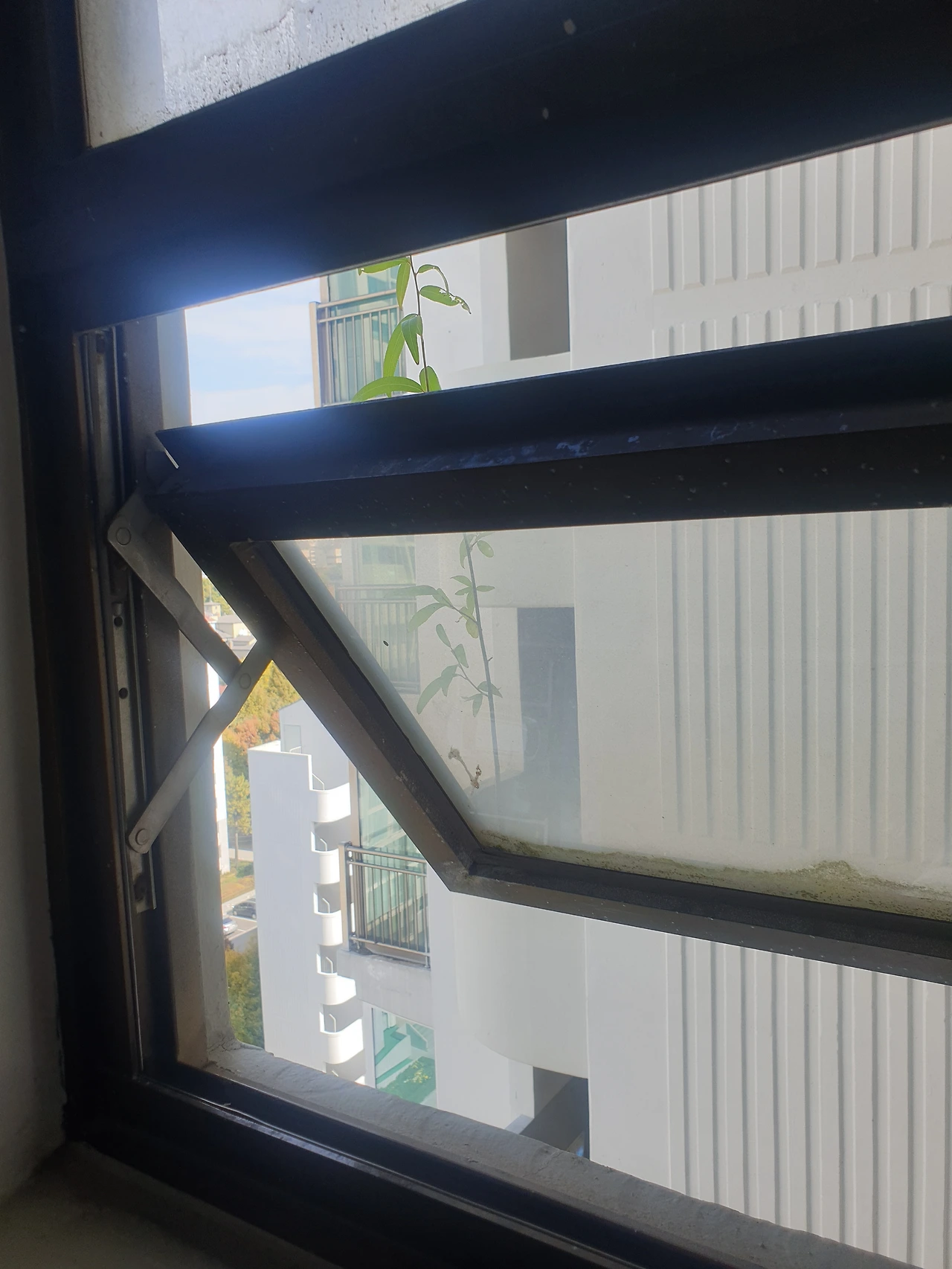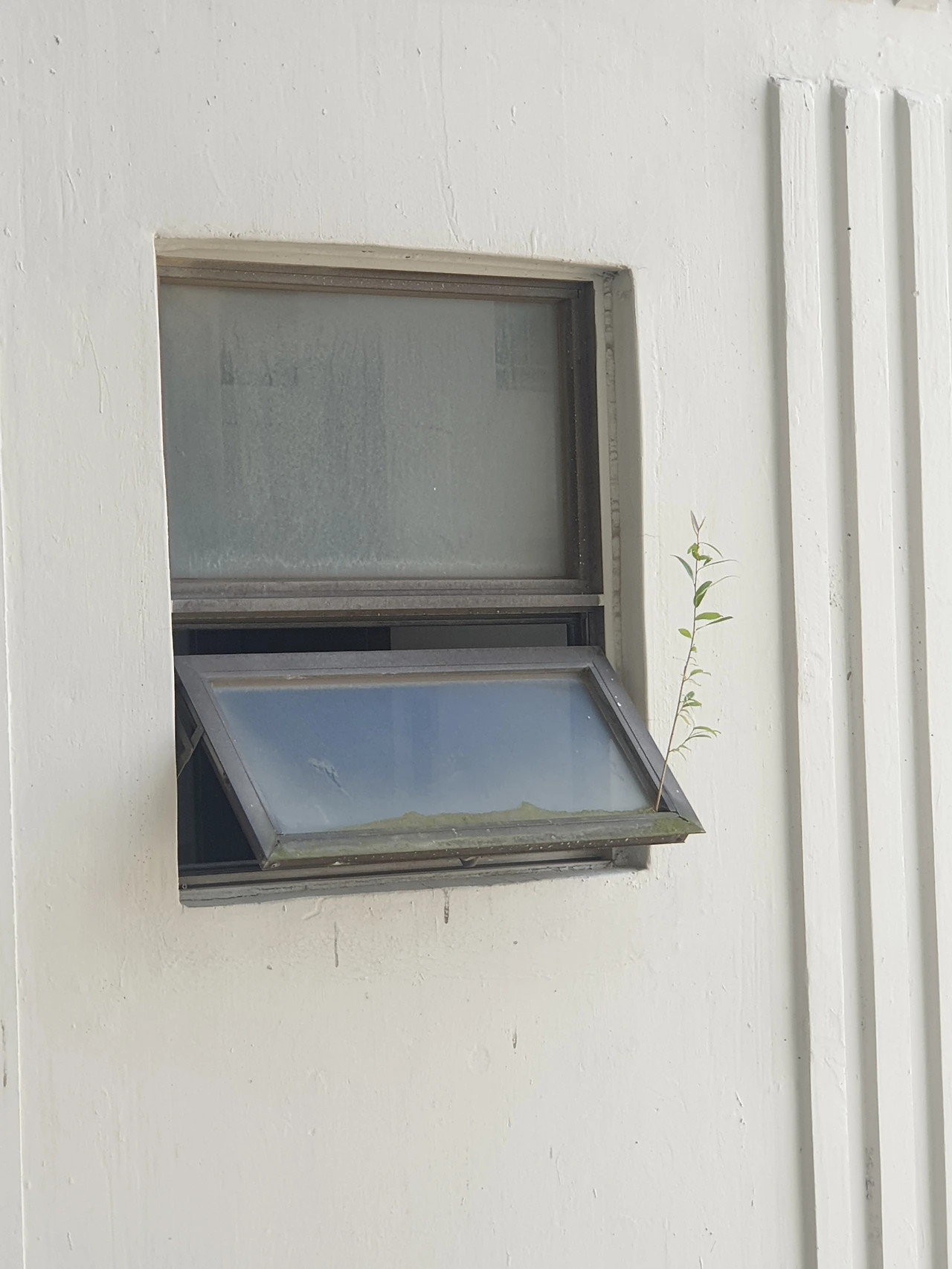 엘리베이터 타는 공간 쪽 창틀에서 피어난 풀잎이
