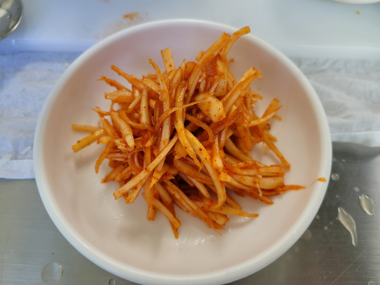 그렇지만 좀 더 얇게 썰었으면 좋았을 것이다. 아직 채 써는 거에 익숙하지 않아서 연습을 더 해야 할 듯싶다. 그리고 도라지 쓴맛을 빼기 위해 소금에 절였다가 헹구는 과정이 있는데 그 후 키친타월로 물기를 빼줬어야 했는데 깜빡해서 물기가 좀 있다.
