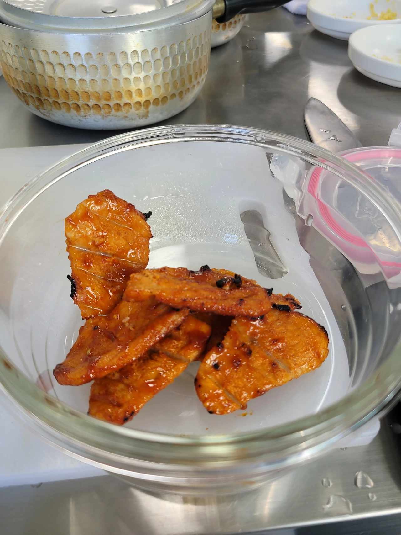 제육구이제육이 너무 두껍게 썰려서 치킨같이 나왔다. 나는 다른 건 다 좋은데 얇고 예쁘게 썰기가 어렵다. 써는 속도나 이런 게 뒤쳐지지는 않는데 고기를 썰고 야채를 다듬을 때 "얇게" 써는 게 어렵다.