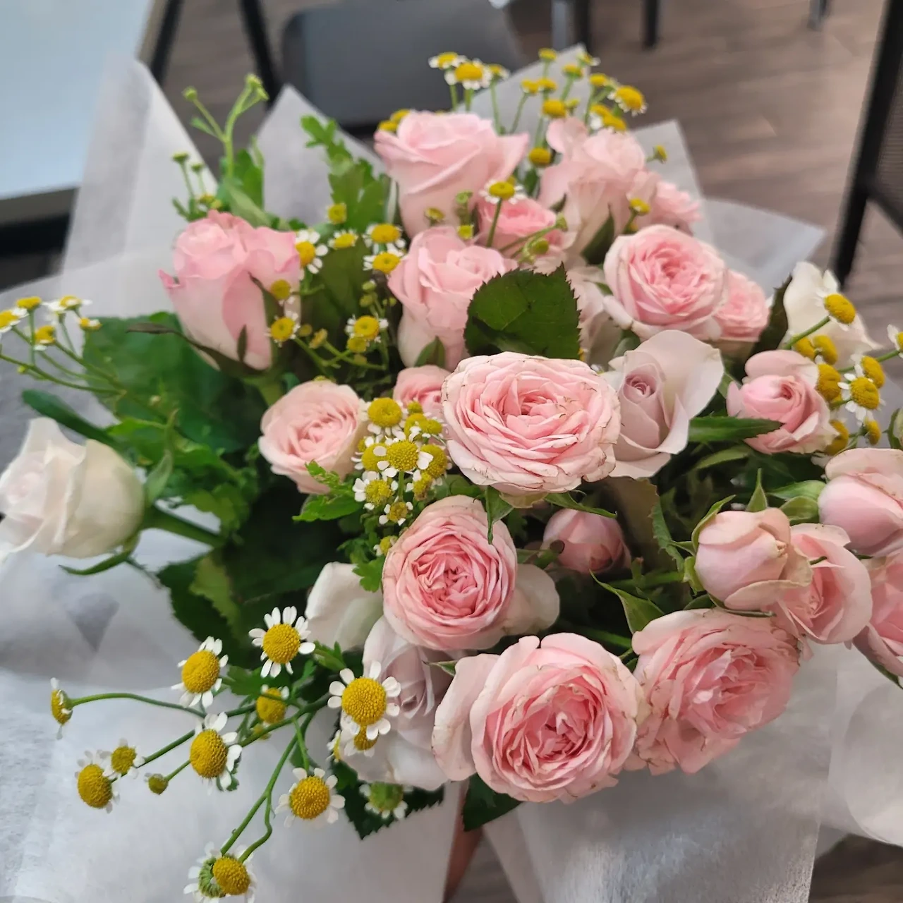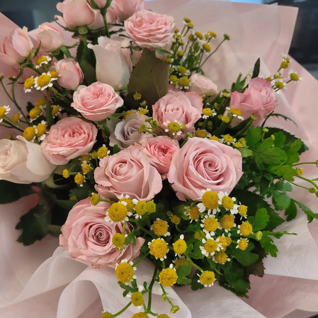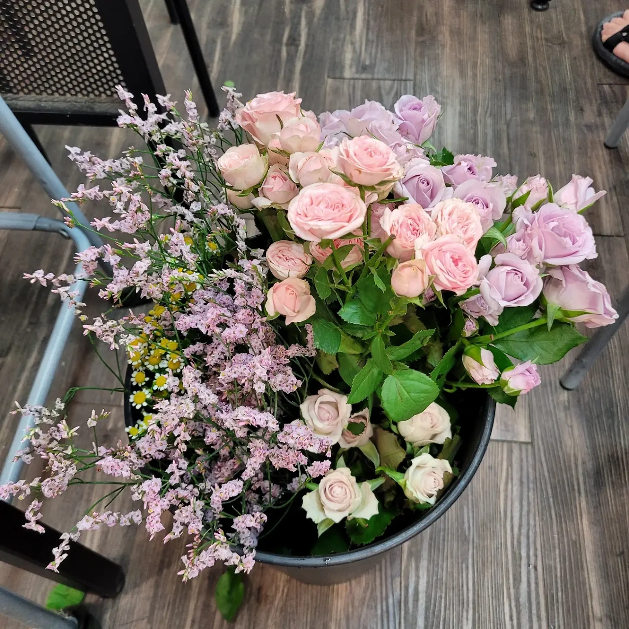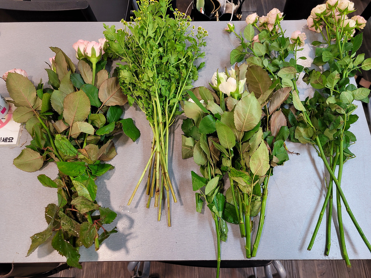 줄기 하나에 머리 하나인 장미들과 줄기 하나에 여러 송이가 붙어있는 장미. 그리고 안개꽃과 같은