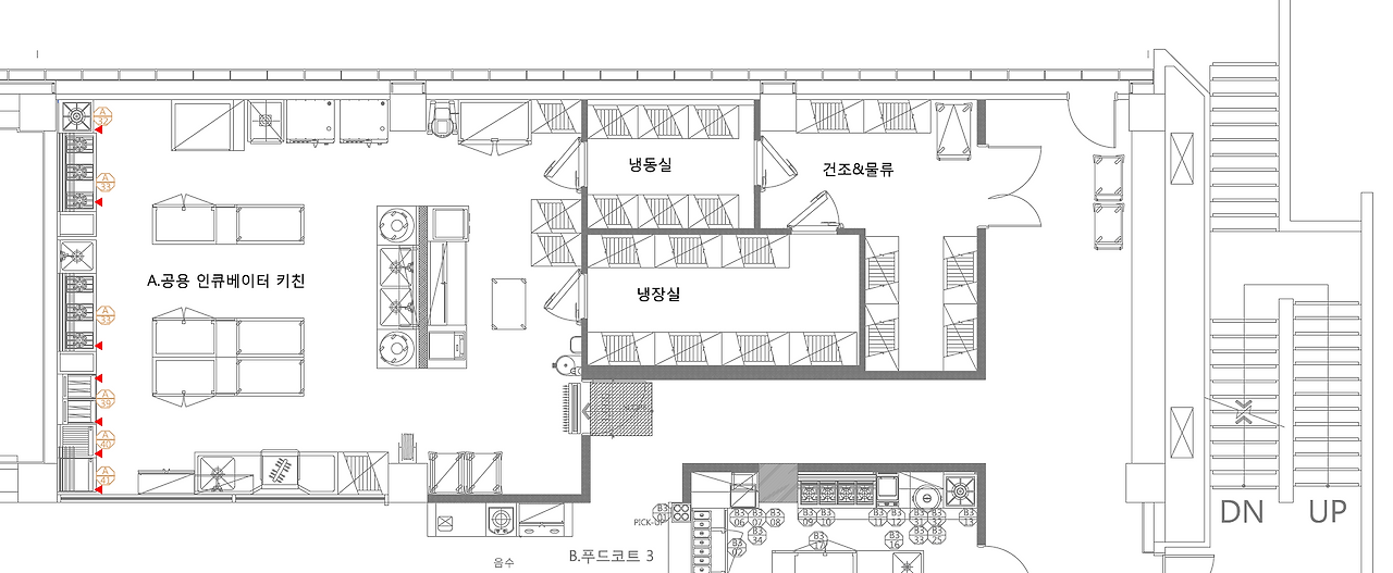 주방 동선과 관련된 부분은 외식업을 하는 사람들이라면 기본적으로 알고 있는 부분이기 때문에 그것이 얼마나 중요한지에 대해서는 이해도가 높을 것이라 생각한다. 다만 여기서 언급하고자 하는 부분은 많은 사람들이 함께 사용하기에 적합한 공유주방의 동선이다. 빼먹으면 안 되는 공간이 몇 가지 있다. 탈의실, 캐비닛, 기물 창고, 건조창고, 냉동창고, 냉장창고, 조리 구역, 세척 구역, 포장 구역, 출하실, 사무업무공간 등. 이 공간들의 기능을 잘 고려해서 자신의 공유주방이 위치할 건물에 동선을 고려한 그림을 그려야 한다. 지금 우리 회사가 운영하고 있는 서울창업허브 지점은 위에 언급한 공간이 모두 구비되어 있지 않다. 굉장히 많이 부족한 상황이다. 아마 이 비즈니스를 하고자 하는 사업자 역시 모든 컨디션을 충족할 만한 상황에 있지는 않을 것이라 생각한다. 그렇지만 적어도 '기능'정도는 꼭 체크를 해서 대안을 만들어 두어야 하고, '룰'을 만들어서 사용자에게 혼선을 주지 말아야 한다. 알겠지만 시공은 중간에 하나 삐끗하면 돈이 추가로 드는 것이 아니라 리셋 수준의 돈과 시간이 소요된다. 설계를 꼼꼼히 하자.