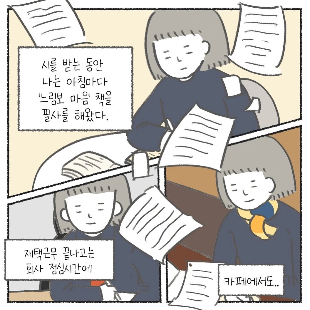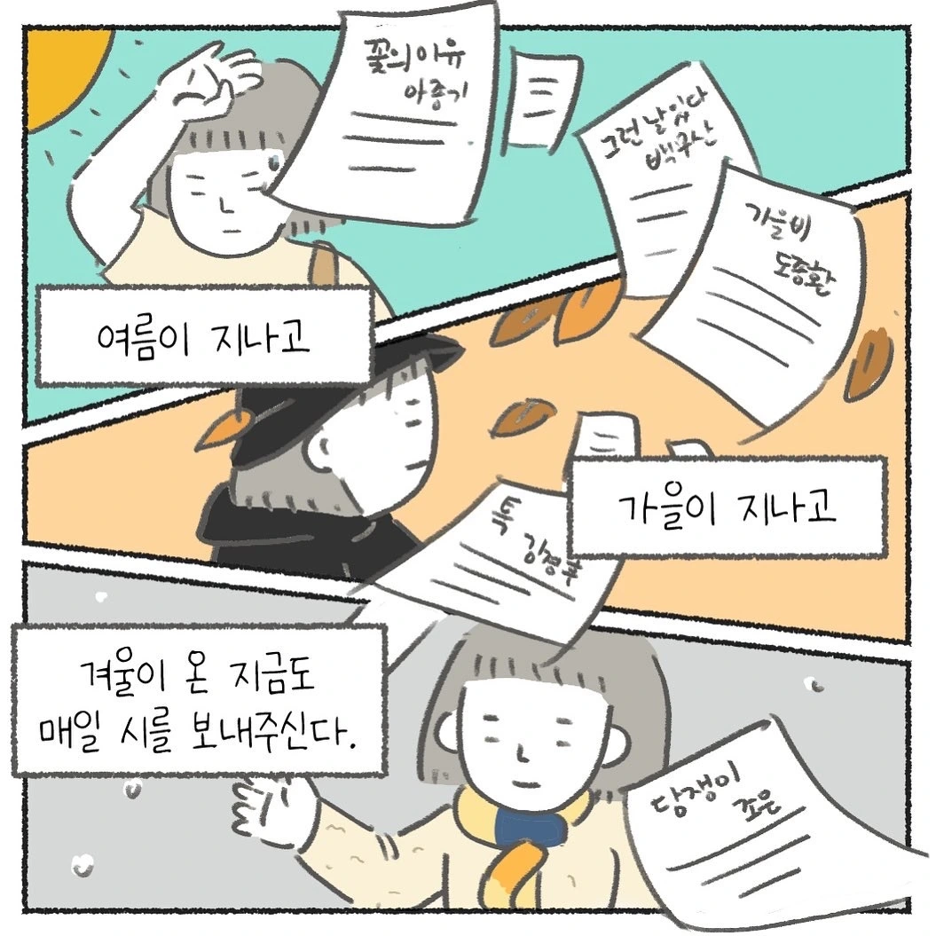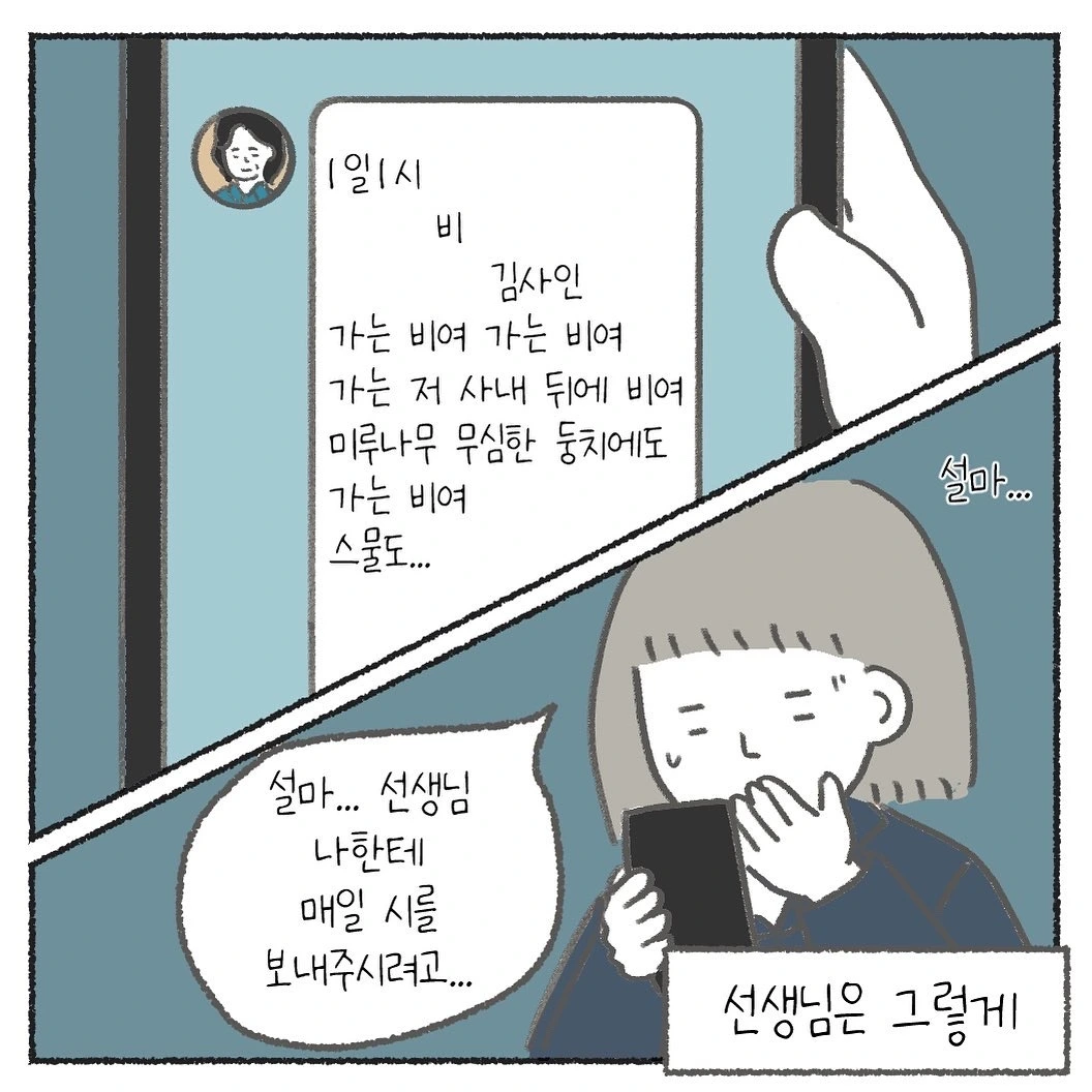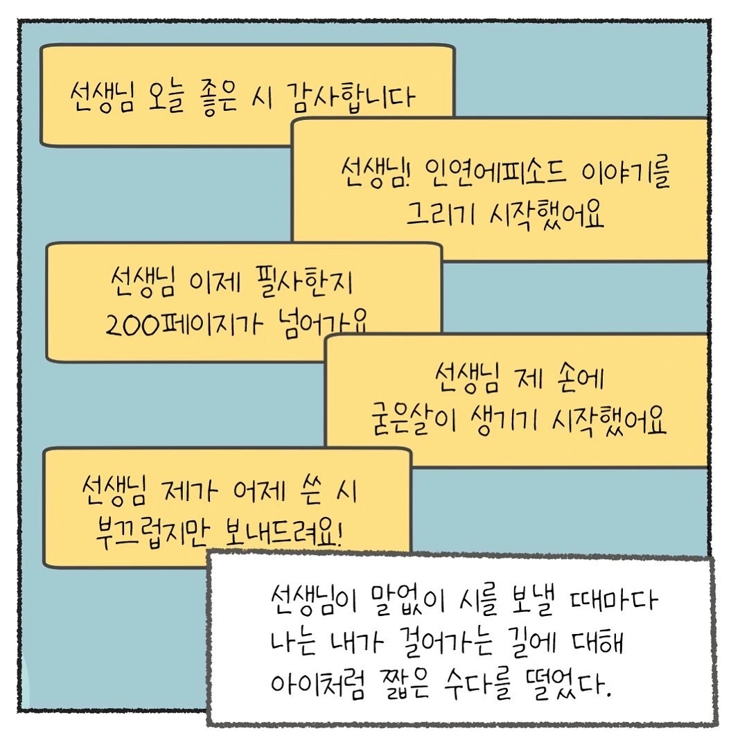 선생님이 아침에 시를 보내시면 저는 바로 답장을 하지 않고 시를 머금고 있다가 중간중간 계속 시를 보면서 저녁때쯤 선생님께 답장을 드리고 있어요. 선생님의 시는 저를 참 많이 이끌어줬던 것 같아요.