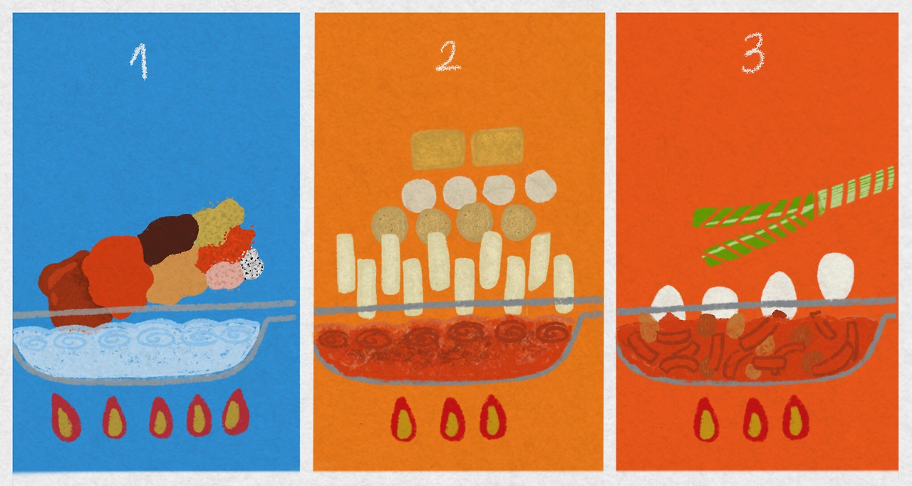 희희네 떡볶이에는 두가지 중요 포인트가 있다. 물론 떡볶이의 모든 것이 중요하지만, 감칠맛과 매운맛의 균형은 그 어떤것보다도 중요하다. 육수를 따로 만들고 싶지는 않지만 감칠맛은 포기할 수 없을때, 한국에서 공수해 온 새우가루는 떡볶이 국물의 필수 요소! 매운 맛은 안 매운 고추장 반, 아주 매운 고추장 반을 섞어서 만든다. 매운 맛을 좋아하는 희희와 맵찔이 파트너의 취향을 반반 존중한 매운맛이다. 그리고 사실 근거는 없지만 섞어서 쓰면 왠지 더 괜찮은 매운맛이 나는 것 같다.