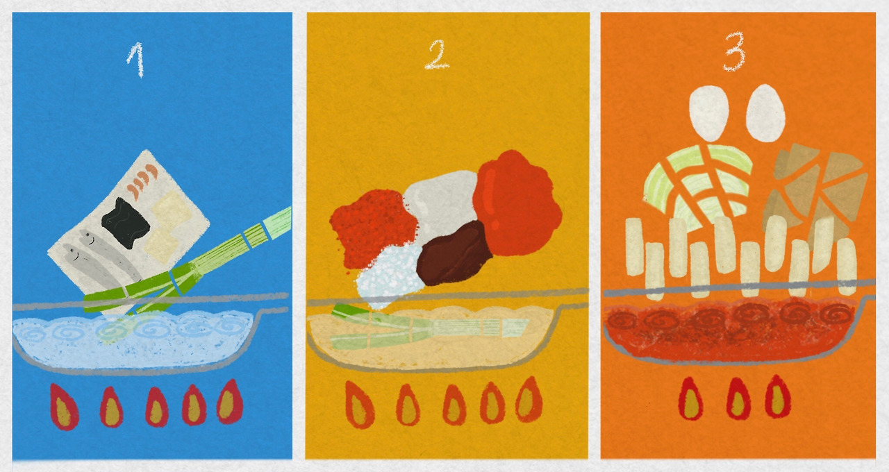 1. 넓고 깊은 팬에 멸치다시마와 대파를 넣고 물을 끓인다.
