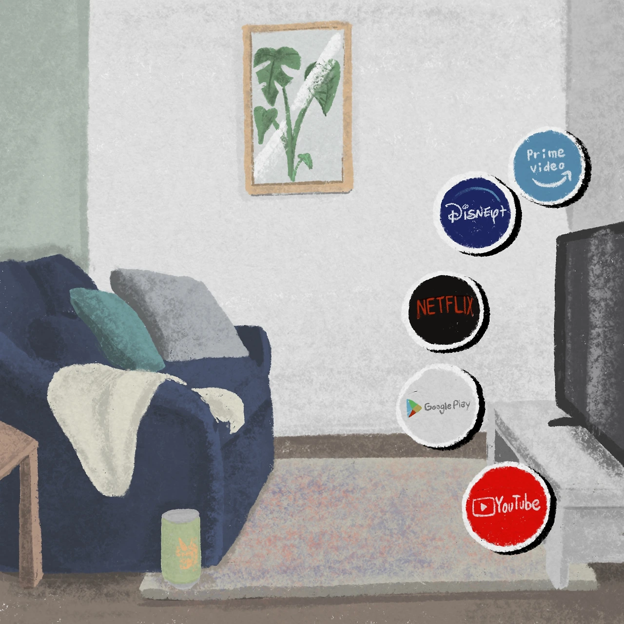 상상 속의 현관문을 열고 들어오면 가장 먼저 보이는 공간, 우리의 거실. 나른하게 소파에 기대어 채널을 돌리는 누군가의 모습이 떠오를 것이다. 희희와 졔졔는 수많은 플랫폼을 애청한다.
