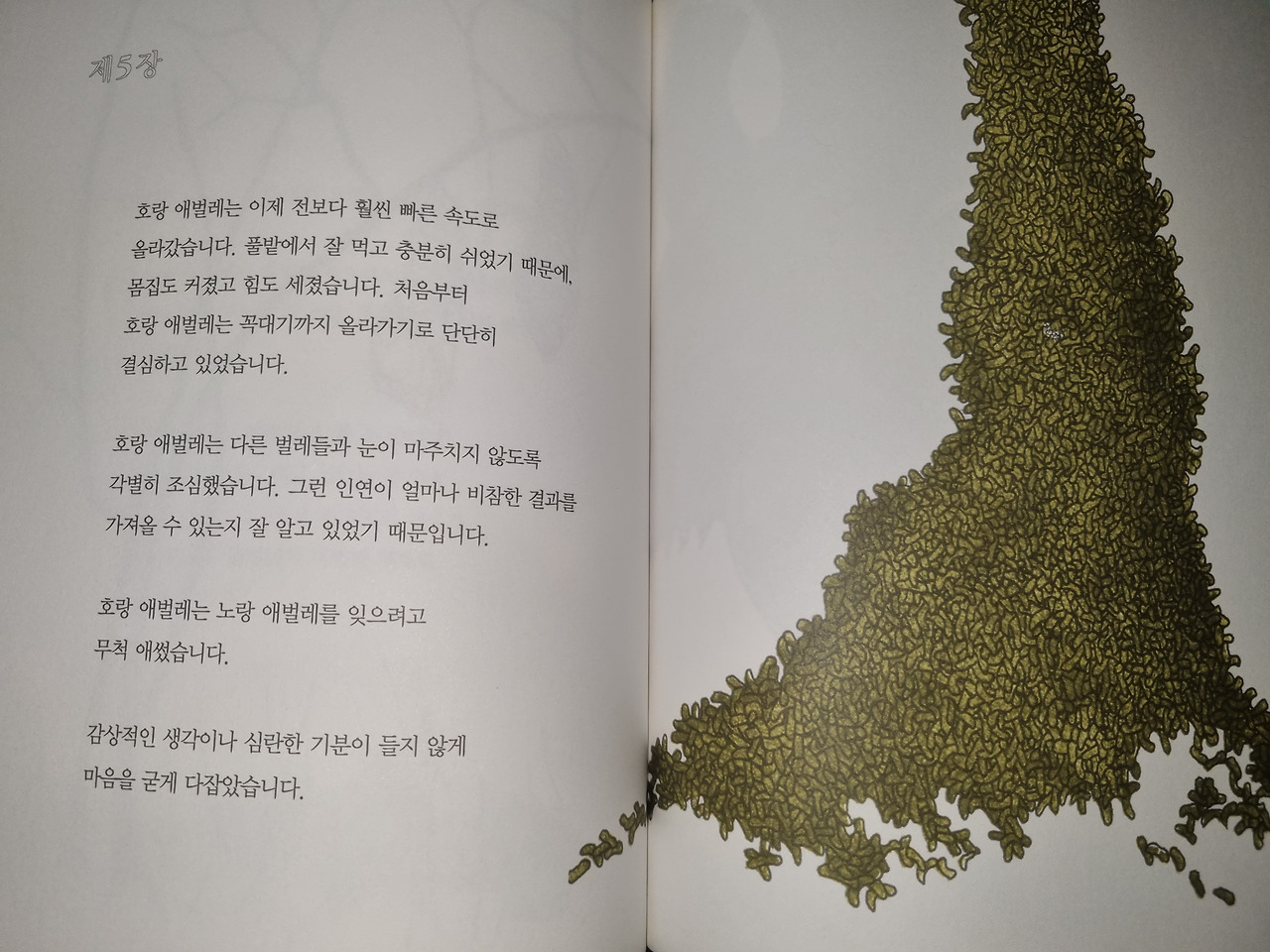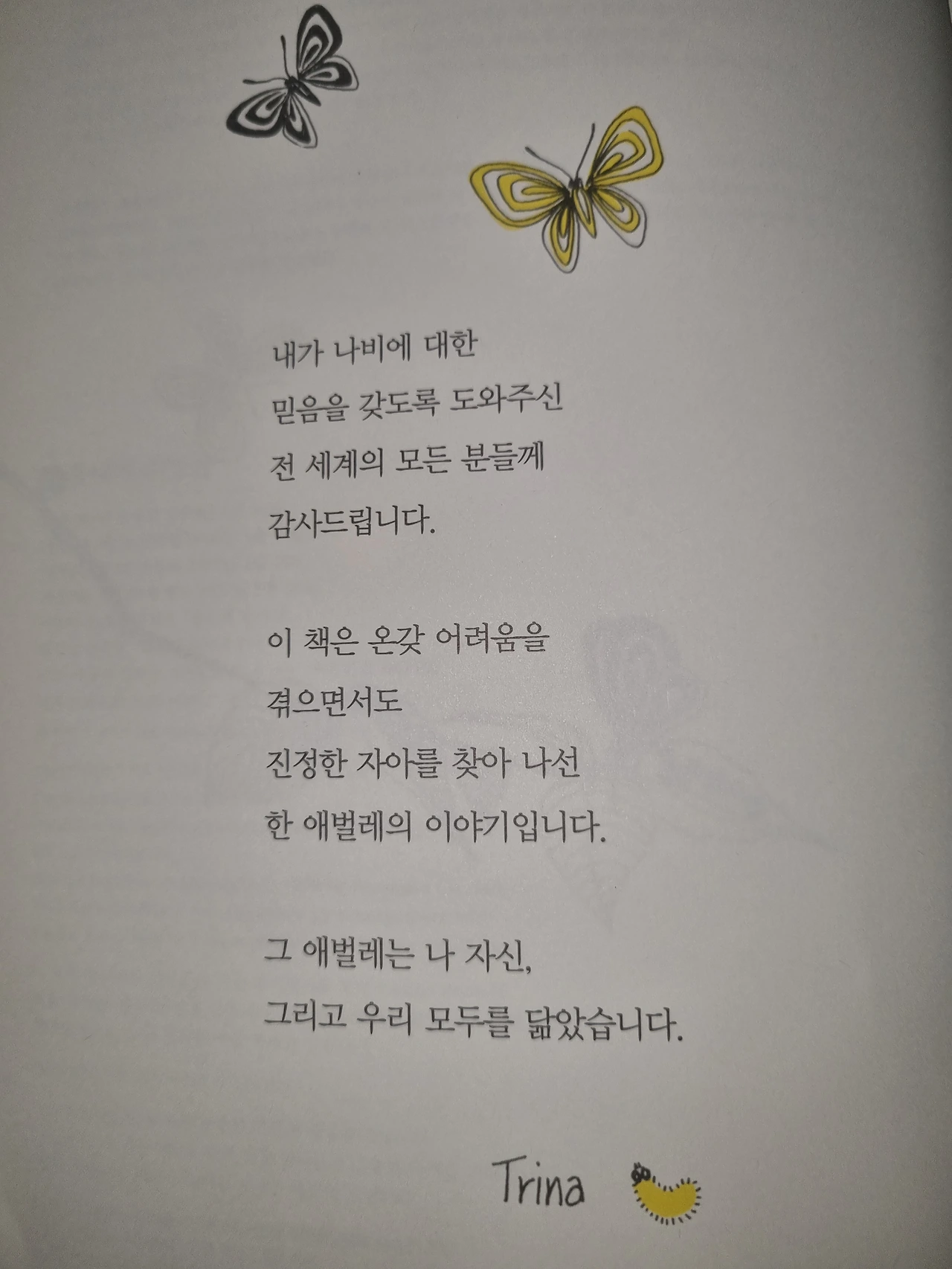 사춘기 딸이 집어든 이 노란 책은 그녀에게 큰 영감을 주었다. 같이 읽으며 한 장을 넘길 때마다 잠시 고른 숨이 필요했던 책이었다. 생텍쥐페리의 <어린 왕자>처럼 유명하진 않지만 비슷한 잔잔함으로 나비 두 마리의 삶을 통해 진정 추구해야 하는 삶의 목적이 무엇인지 생각해 보는 시간을 주는 책이다.