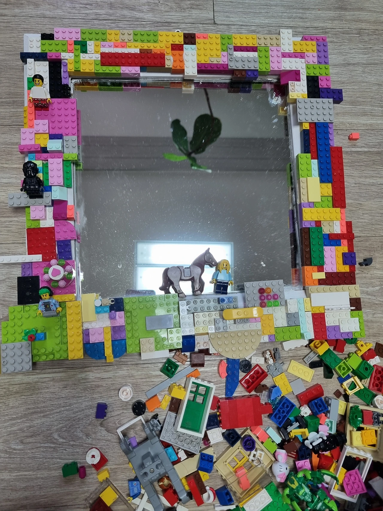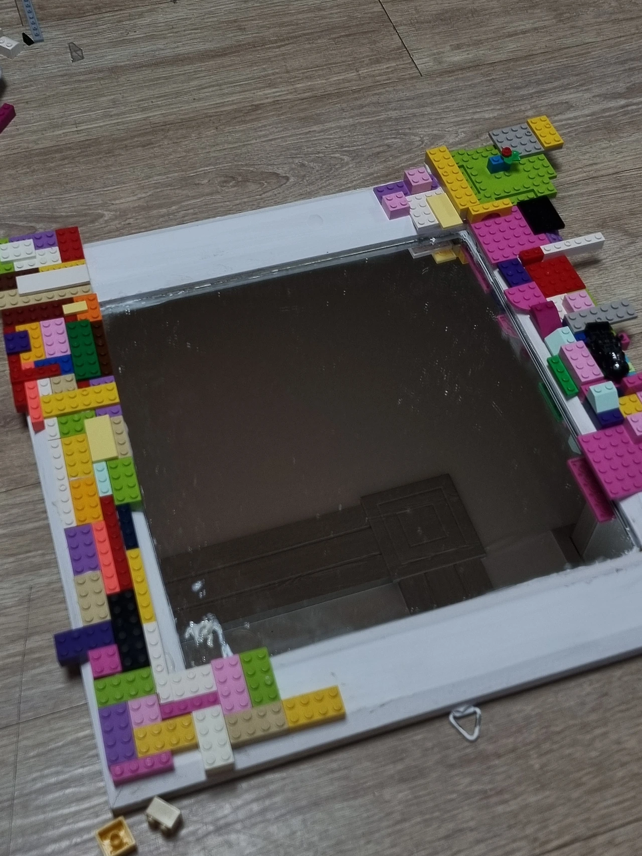 거울 프레임이 원목인줄 알았는데 나무 스티커로 된 보기에만 나뭇결의 거울을 바라보다가 이미 손길이 떠난 레고를 활용해 거울을 다시 만들었다.