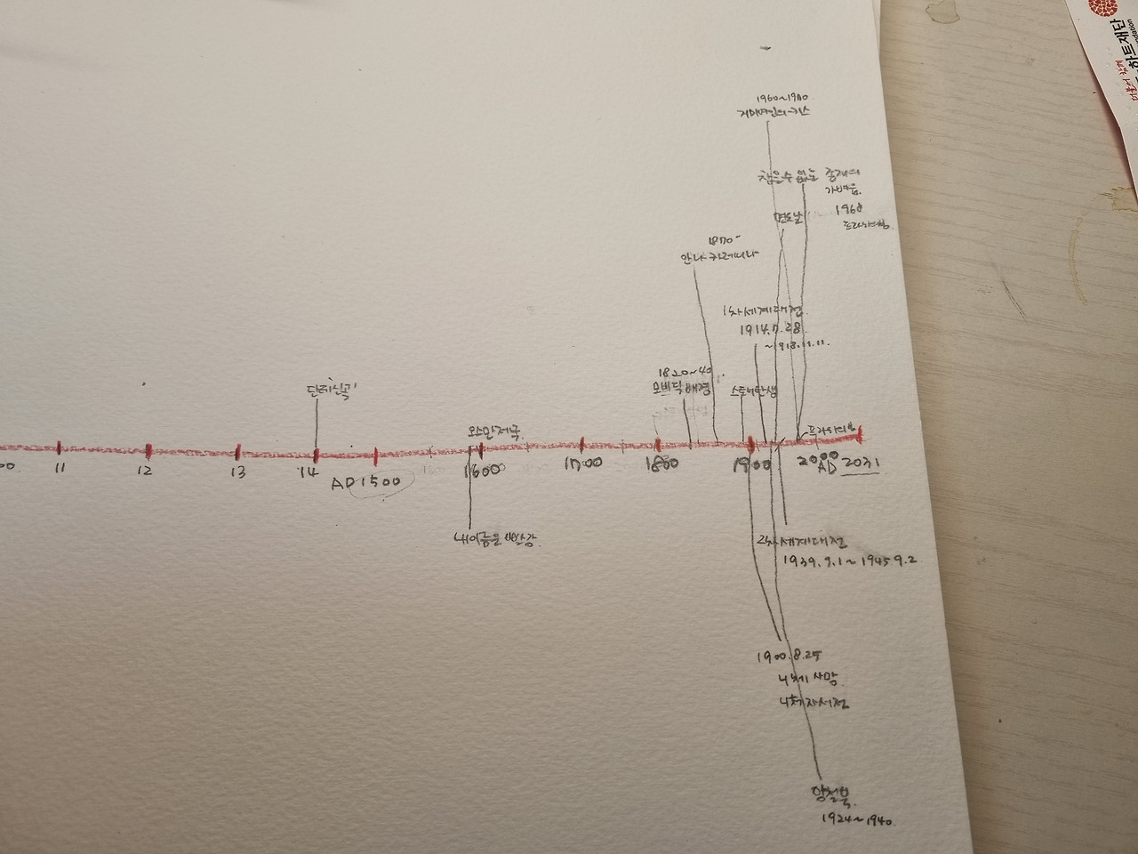 책을 읽는데 있어서 역사의 시대적 배경을 알고 있다면 조금은 더 리얼한 상상접근이 가능하겠다. 그러니까 몰입에 필요한 기본 요소가 충족되지 못한 상태로 글을 읽는것 보다 낫겠다.역사를 통해 지나온 일들에 대한 감성을 도화지로 둔다면 더 세밀하게 읽어내려갈 수 있겠다. 그래서 큰 도화지에 기원 전과 후로 그림을 그리고 읽었던 책들이 어느 시점에 있었는지 적어보았다. 그랬더니 전보다 또렸하게 보인다.