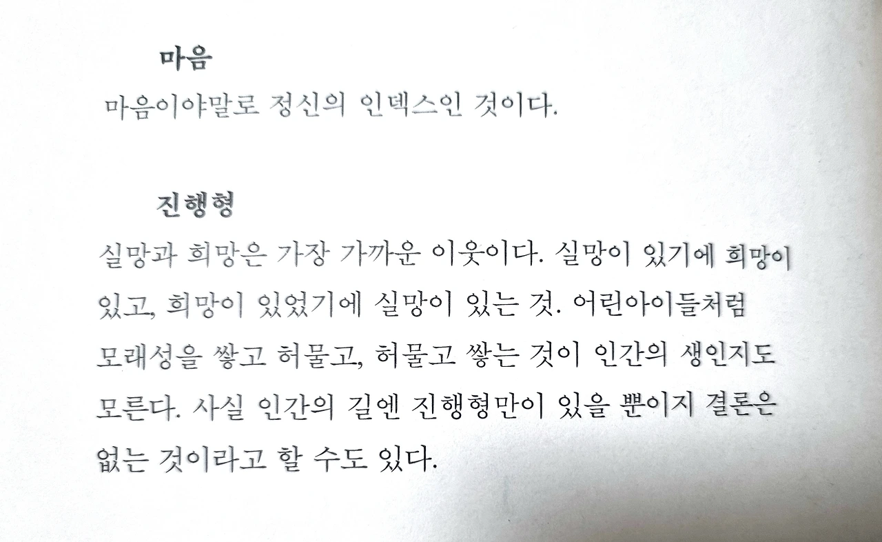 하루를 보내고, 도서관에서 빌린 책을 무심코 폈다. 이어령의 말에는 진행형이라는 제목 아래 '희망'과 '실망'의 관계에 대해 내가 보지 못했던 방향의 각도를 조망하라고 알려주었다. 실망이 있기에 희망이 있고 희망이 있기에 실망이 있다라는 말.