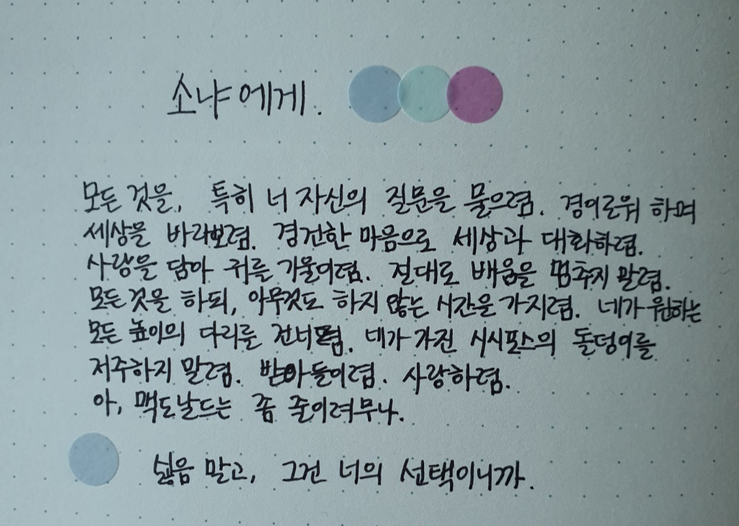 나도 어디 한 켠에 아들들에게 남기는 글을 남겨두고 싶다. 나 자신에 대한 질문과 성찰, 인생을 경이롭게 겸손하게 받아들이는 마음,