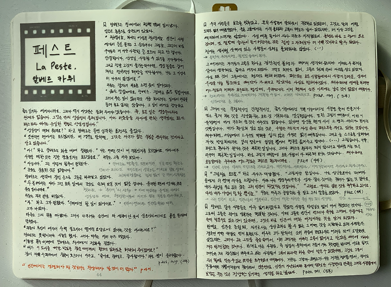 독서 시작 전에 필사 노트 구성을 마친다. 도서의 기본 정보를 적고, 주요 인물들을 메모한다. 챕터별로 칸을 나누어 놓고 한 챕터 읽을 때마다 문장을 옮긴다. 좋은 문장을 모두 필사한다면 통필사를 하게 된다. 지면에 제한을 두는 것이 좋다. 먼저 프레임을 만들고 그 안을 채우는 것을 추천한다. 문장과 나의 단상을 함께 적는다. 독서를 마치는 순간, 필사 노트도 완성된다. 이렇게 방대한 책은 독서 후의 필사가 쉽지 않다. 문장은 너무 많고, 내용의 연결도 매끄럽지 못하다. 마치 쌓인 숙제처럼 느끼게 된다. 책을 나누어 읽고, 그때마다 정리하는 것이 좋다. 물론, 개인적 의견이지만.