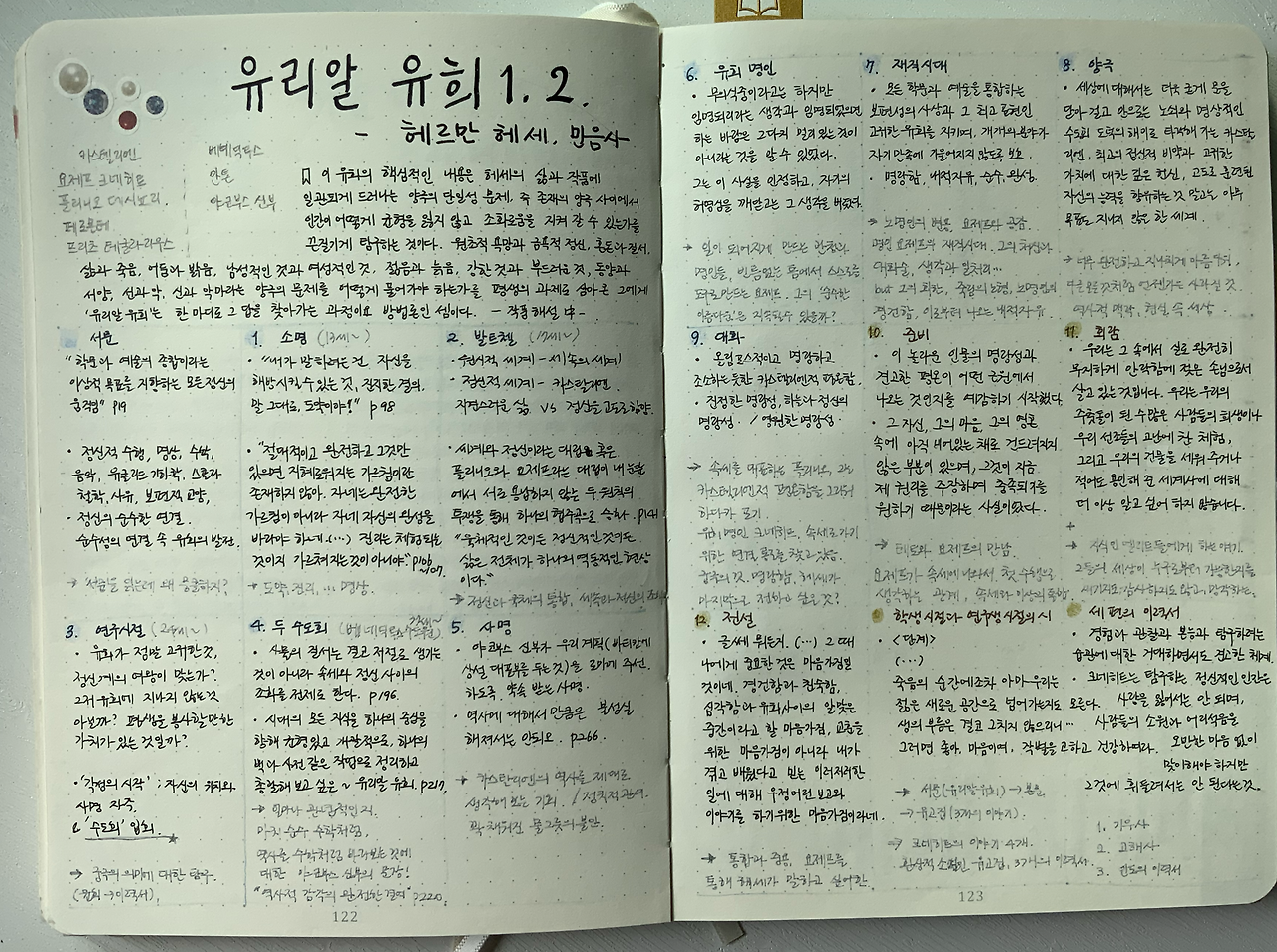 책의 분량이 많고 나누어진 챕터가 많은 경우에는 챕터별로 문장을 선택해서 필사하는 것을 추천한다. 이는 방대한 분량을 정리하며 읽는 효과도 있고, 필사를 수월하게 하려는 의도도 있다. 예를 들어 헤르만 헤세의 <유리알유희 1,2>는 분량에서 먼저 압도되고, 그 내용도 여러 번 생각하게 만드는 면이 있다. 필사를 하는 중간에도 펜의 움직임을 멈추고 다시 고민하게 되는 부분이다. 이런 책을 읽을 때는 나름의 구조를 먼저 잡는다.