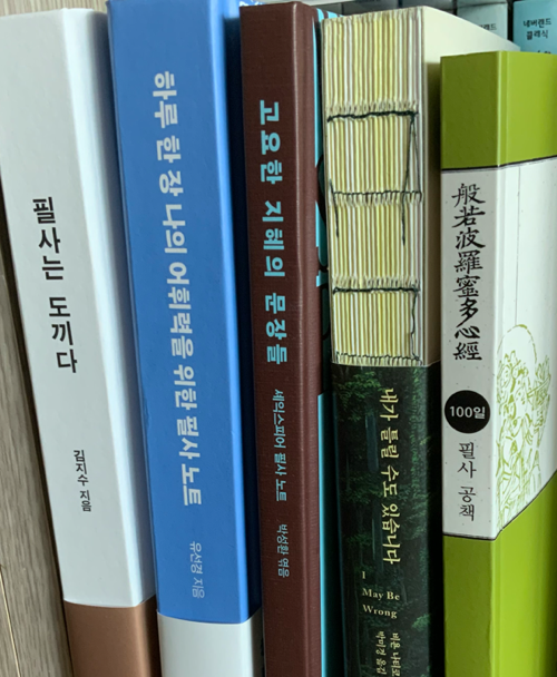 최근 얼마 전까지 필사가 매우 유행이었다. 필사를 위한 책도 여러 권이 나왔다. 출판사마다 그들이 판권을 갖고 있는 책을 소재로 필사용 도서를 만들기도 했다. 출판사로부터 제공받은 몇 권의 필사용 도서를 갖고 있다. 여러 문장을 모아 만든 책, 한 권의 책에서 주요 문장을 수집한 책 등, 주로 문장위주다. 이때, 독자가 선택하는 기준은 책의 품질이다. 다시 말해, 필사에 적합한 책의 형태를 갖추었는가, 펼쳐짐, 종이의 질 등이다.