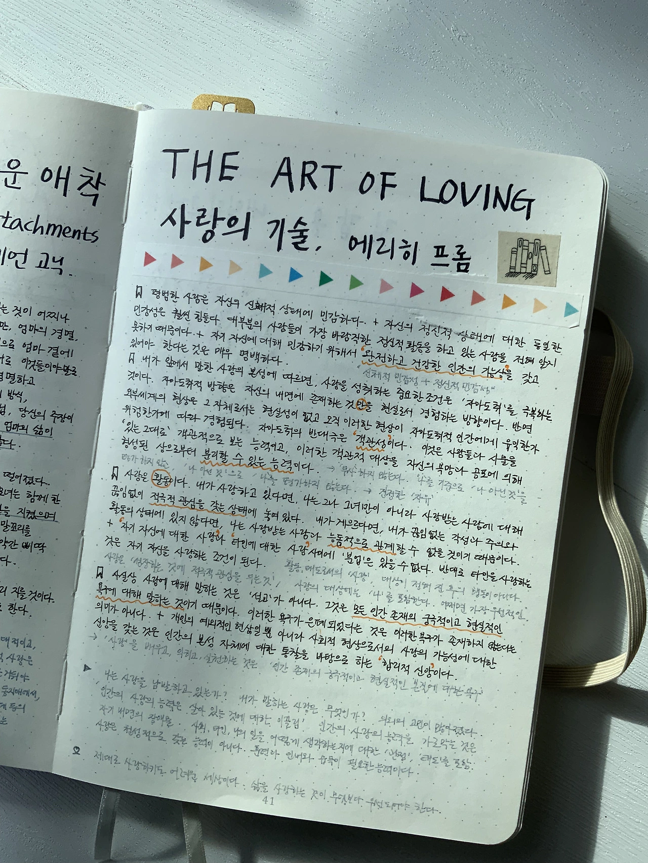 독서 생활자는 문구인을 겸하는 경우가 많다. 이렇게 필사를 하다 보면 필사템에 관심을 가질 수밖에 없다. 손글씨로 써야 하기에 좋은 펜과 좋은 노트, 종이에 대한 욕심이 생긴다. 평소에는 제트스** 펜이면 충분했지만, 필사를 위해서는 무인**의 젤펜이라던가, 주스* 등의 중성펜을 선호한다. 더 좋은 것은 만년필이다. 만년필 역시 입문과 동시에 끝도 없는 세계의 심연을 보게 된다. 만년필을 택한다면 노트도 신중히 선택해야 한다. 만년필 잉크가 번짐 없이 스며들어야 하고, 뒷비침이 적은 종이를 골라야 하기 때문이다. 이런 종이는 보통 가격이 비싸다. 흔히 쓰는 노트 가격의 몇 배를 넘어간다. 하지만, 일 년에 한 두권 정도의 필사 노트를 쓰게 된다면 그 정도는 투자할 수 있다. 취미에 대한 투자이기 때문이다. 그리고 양념 같은 스티커나 마스킹 테이프. 단조롭게 글씨만 있는 것보다 포인트를 주면 산뜻하다. 어떤 이는 오로지 글씨로 채우기도 한다. 이 역시 개인의 취향이다. 다양한 변주가 가능하다.